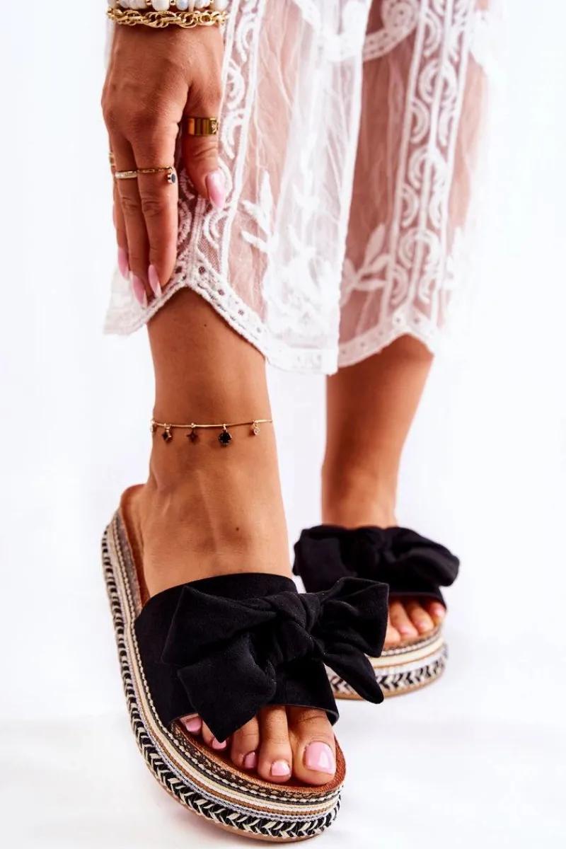 Klasyczne damskie klapki zostały osadzone na masywnej, korkowej platformie z wieloma zdobieniami. Wykonane z wierzchu z eko zamszu. Na przodzie znajduje się ozdoba w postaci kokardy. Profilowana wkładka jest wykonana z przyjemnego w dotyku eko zamszu. Podeszwa wykonana z tworzywa sztucznego. Model klasyczny, wsuwany. Te klapki to idealny model na lato! Przy wyborze rozmiaru prosimy sugerować się tabelą rozmiarów.
