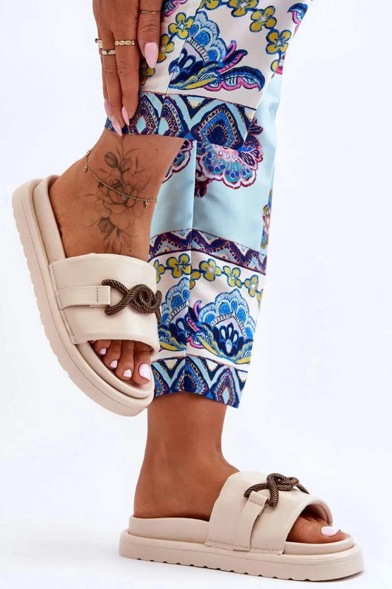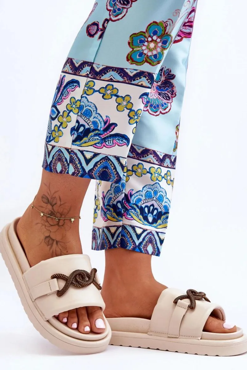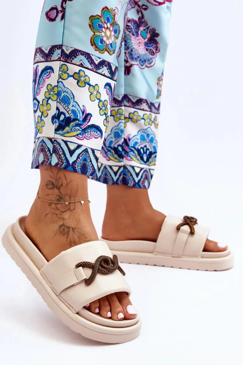 Klasyczne, damskie klapki zostały wykonane z eko skóry. Model ten posiada na przodzie ozdobę w postaci imitacji plecionego sznura. Klapki osadzono na delikatnej platformie. Wkładka jest profilowana i wygodna w użytkowaniu. Nosek w tym obuwiu jest odkryty i lekko zaokrąglony. Ten model powinien znaleźć się właśnie w Twojej garderobie! Przy wyborze rozmiaru prosimy sugerować się tabelą rozmiarów.
