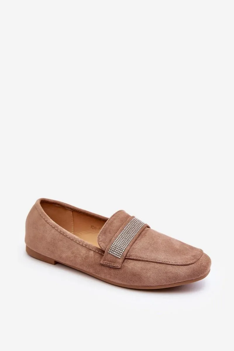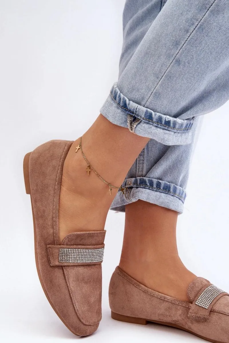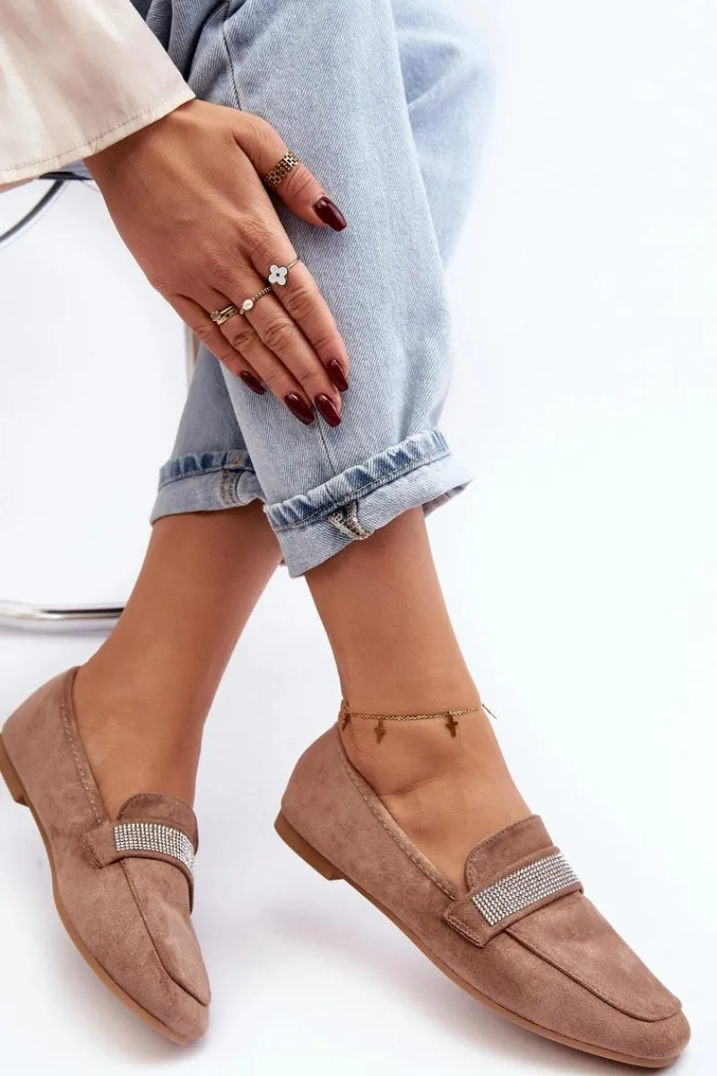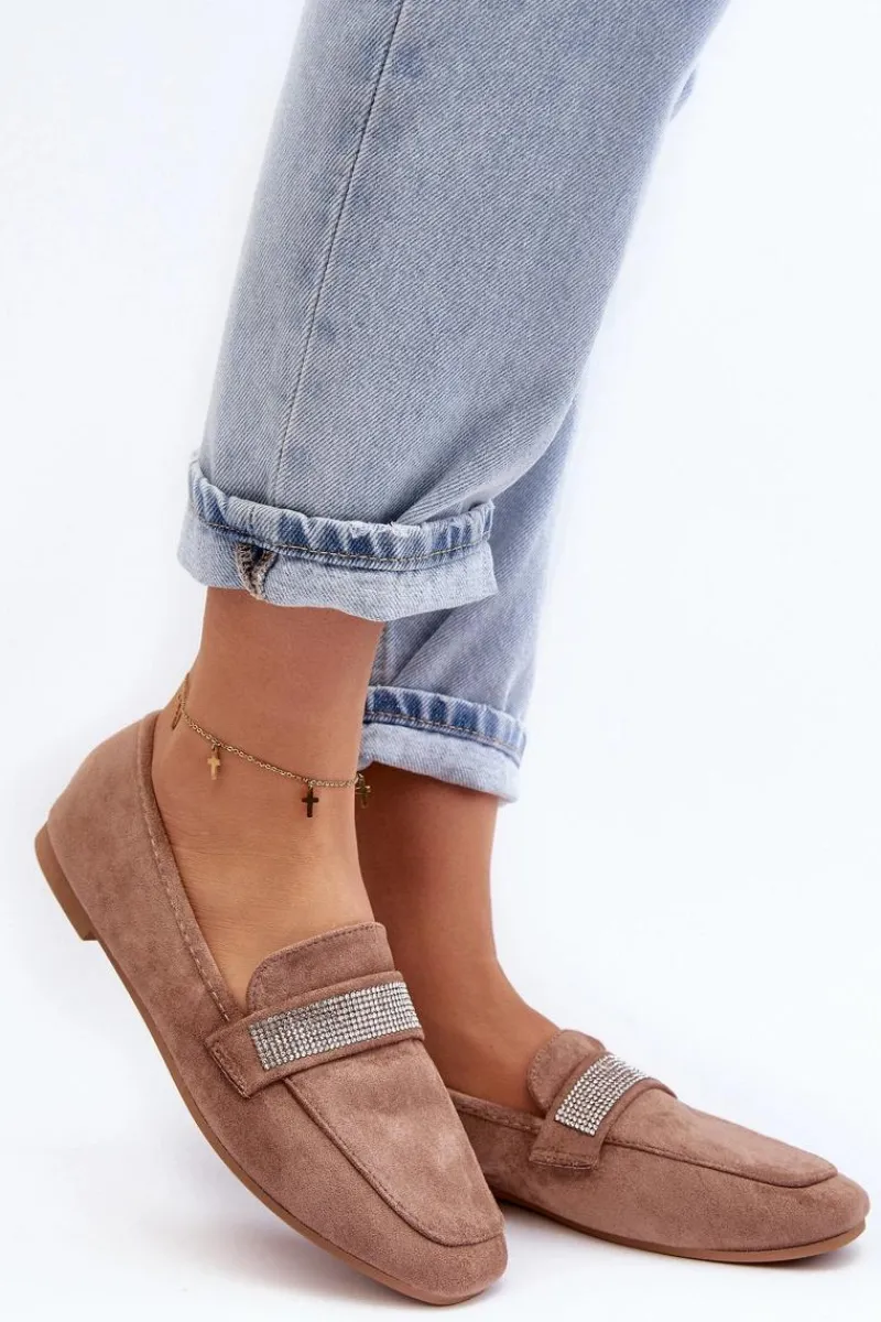 Mokasyny damskie wykonane z eko zamszu. Osadzone na płaskim obcasie. Noski zaokrąglone. Z przodu na pasku liczne, małe cyrkonie. Miękka i profilowana wkładka z eko skóry gwarantuje komfort noszenia przez cały dzień. Stylowe mokasyny to niezbędny element kobiecej garderoby! Koniecznie musisz je mieć! Przy wyborze rozmiaru prosimy sugerować się tabelą rozmiarów.
