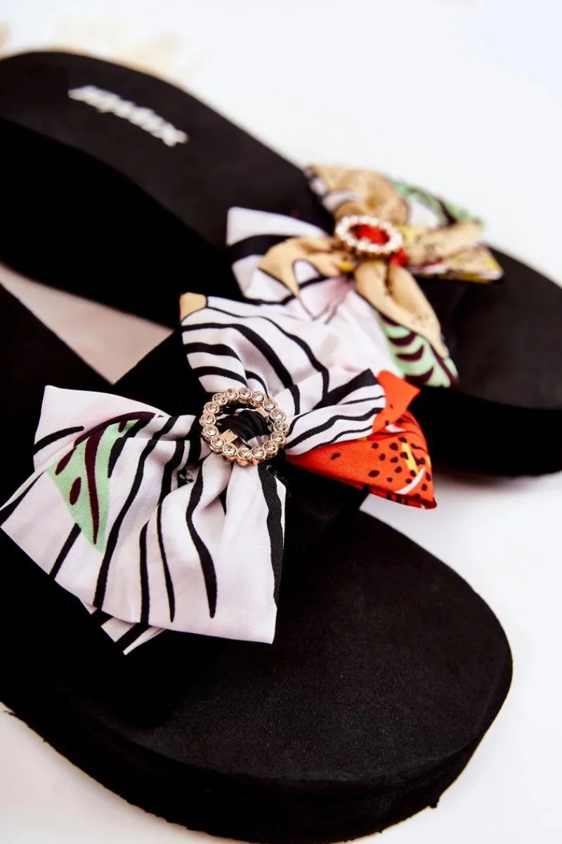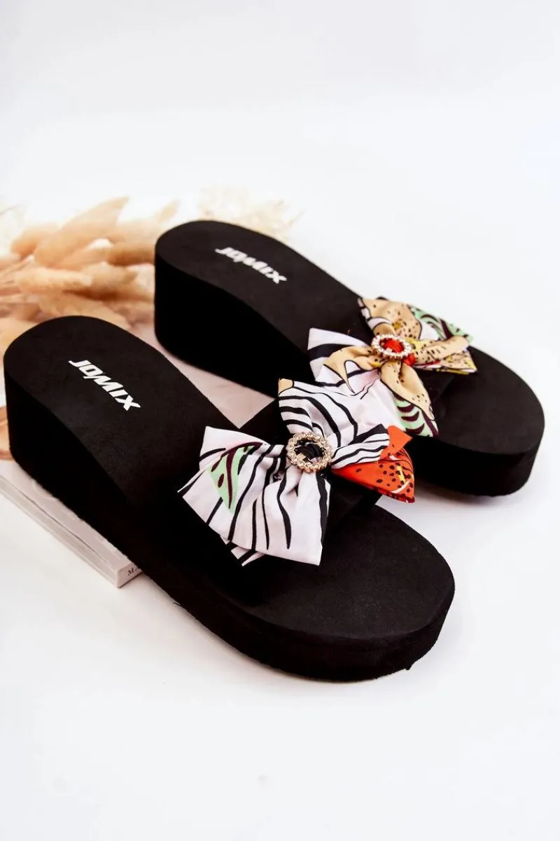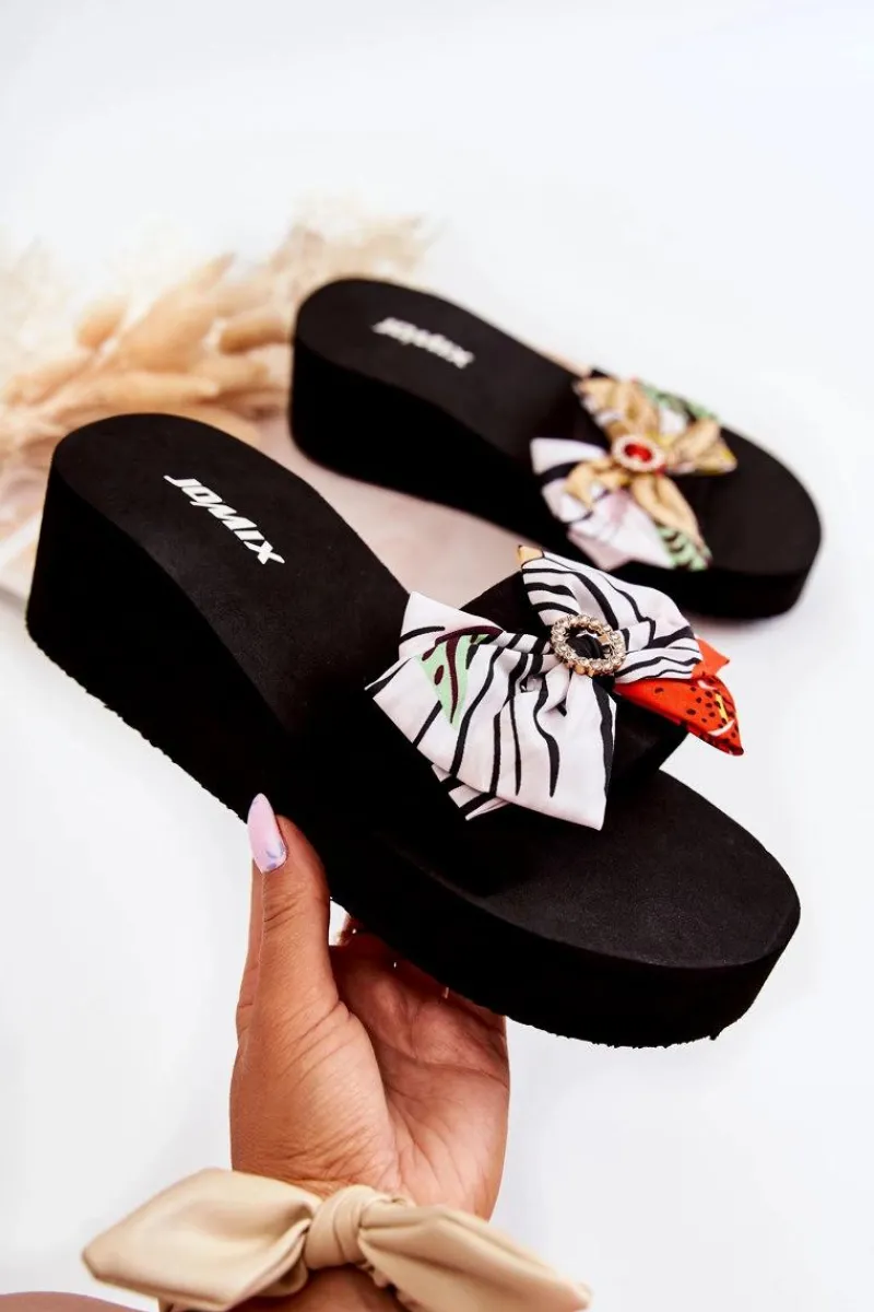 Klasyczne klapki damskie osadzone na koturnie oraz platformie. Pasek wraz z kokardą wykonane z materiału tekstylnego. Podeszwa wraz z koturnem zostały wykonane z piankowego tworzywa. Fason, który na pewno spodoba się niejednej miłośniczce modowych inspiracji! Kokarda została przyozdobiona elementem z tworzywa sztucznego z dżetami imitującymi cyrkonie. Przy wyborze rozmiaru prosimy sugerować się tabelą rozmiarów.