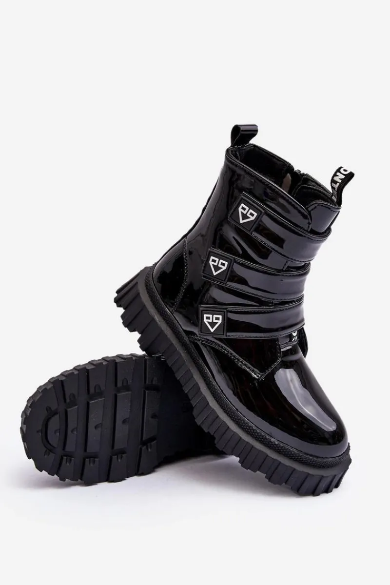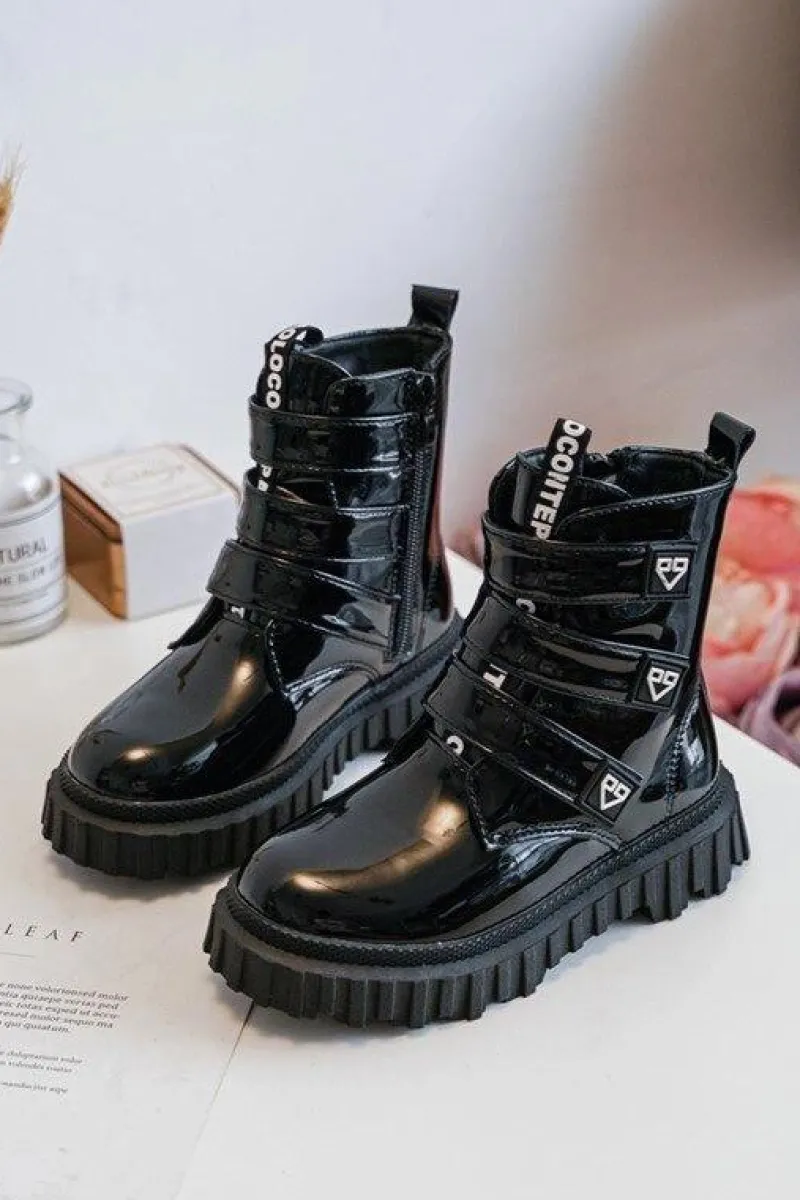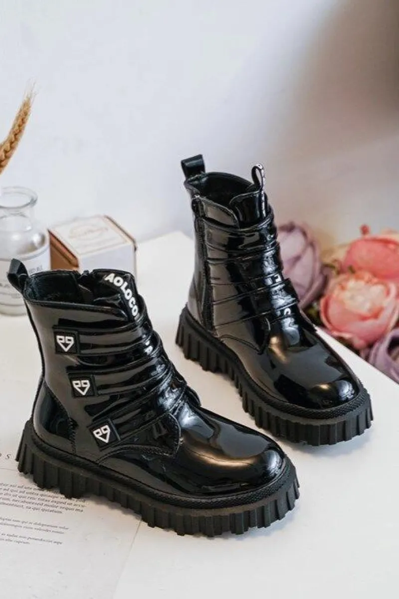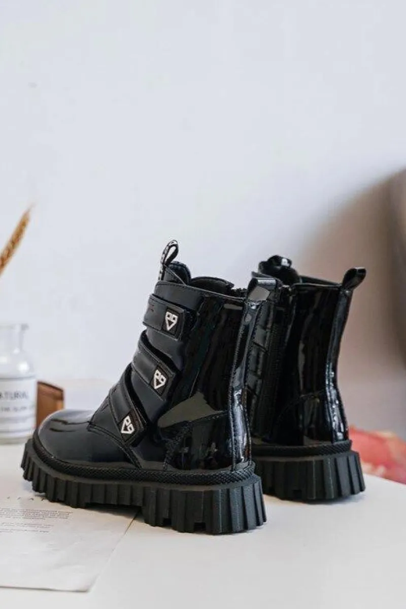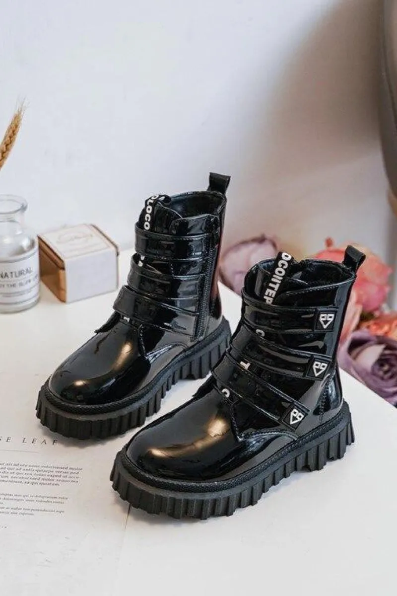 Botki dziewczęce wykonane z eko skóry. Osadzone na platformie i płaskim obcasie z gumowego tworzywa. Cholewka za kostkę. Model zapinany na suwak oraz rzepy. Noski zaokrąglone. Środek ocieplony futerkiem. Zapiętek jest usztywniony. Koniecznie sprawdź także pozostałe modele dziecięcych botków! Przy wyborze rozmiaru prosimy kierować tabelą rozmiarów.