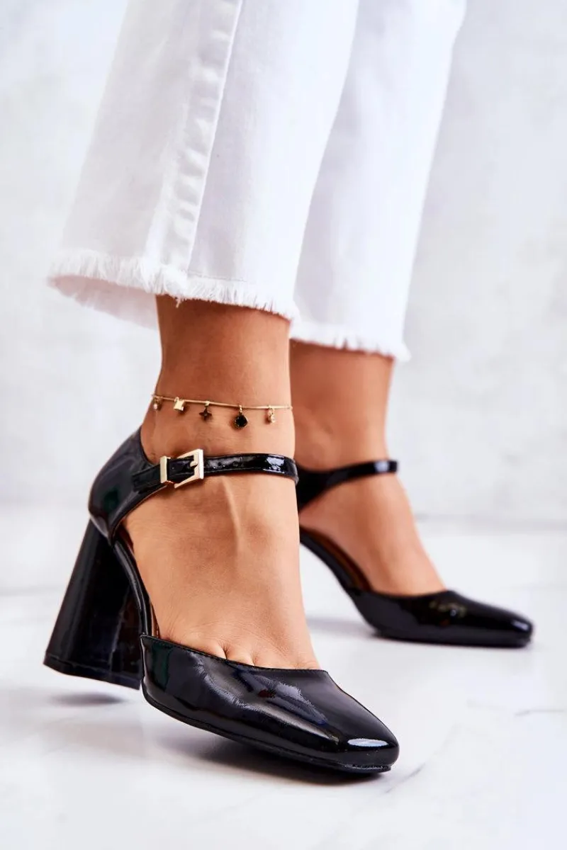 Klasyczne czółenka wykonane z lakierowanej eko skóry. Pięknie prezentują się na nodze. Obcas w postaci stabilnego słupka. Zapinane wokół kostki na regulowany pasek ze sprzączką. Nosek zakryty, kwadratowy. Miękka, wykonana z eko skóry wkładka zapewni komfort na każdym kroku. Modne i stylowe czółenka doskonale będą komponować się z eleganckimi, szerokimi spodniami czy z sukienką o fasonie marynarki. Uniwersalność, elegancja i wygoda – te cechy idealnie określają ten model czółenek! Przy wyborze rozmiaru prosimy kierować się tabelą rozmiarów