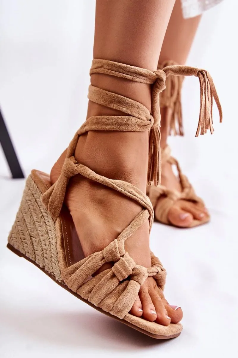 Modne, wiązane sandały zostały wykonane z eko zamszu. Posiadają koturn z jutową plecionką. Model wiązany z frędzelkami. Wkładka z eko skóry zapewni komfort podczas użytkowania. Podeszwa wykonana z gumowego tworzywa jest antypoślizgowa. Ten niesamowity model wzbogaci Twoją letnią garderobę! Sandałki posiadają odkryty, kwadratowy nosek. Przy wyborze rozmiaru prosimy sugerować się tabelą rozmiarów.