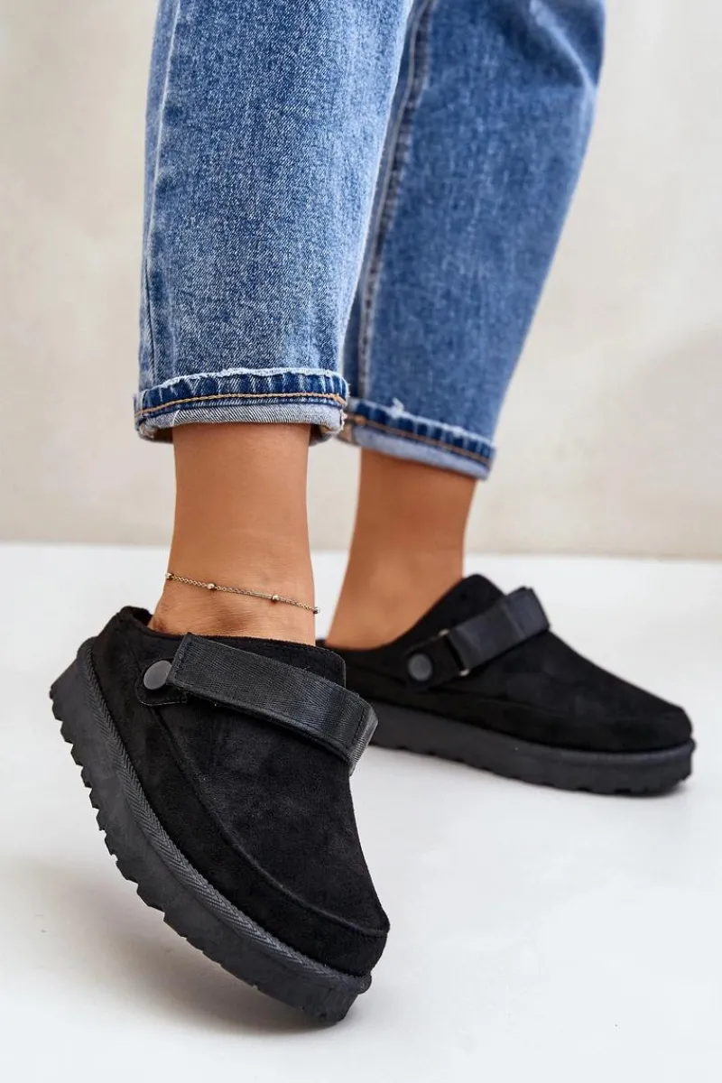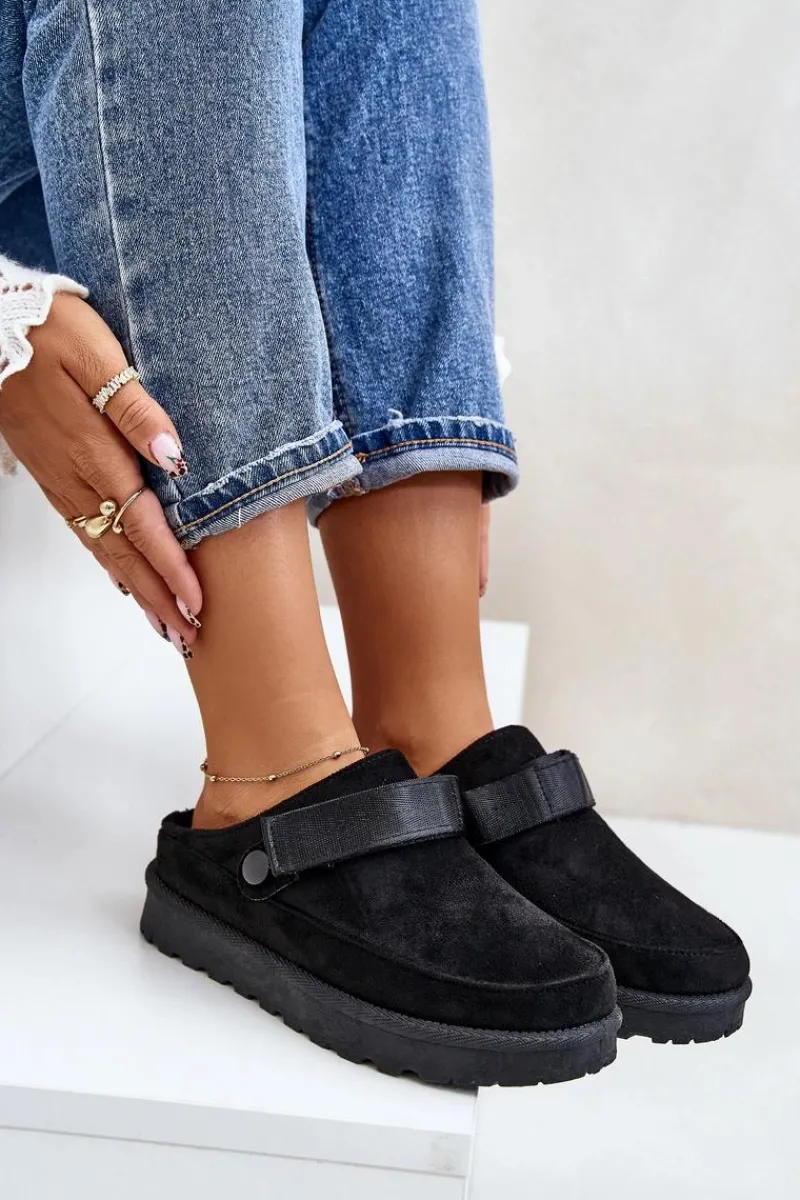 Damskie klapki wykonane z eko zamszu. Osadzone na platformie. Wnętrze ocieplone przyjemnym futerkiem, co zapewnia komfort w chłodniejsze dni. Dodatkowo posiadają ruchomy pasek zapinany na rzep, który stabilizuje piętę i umożliwia idealne dopasowanie. Idealne na co dzień, łączą styl z funkcjonalnością. Przy wyborze rozmiaru prosimy sugerować się tabelą rozmiarów.