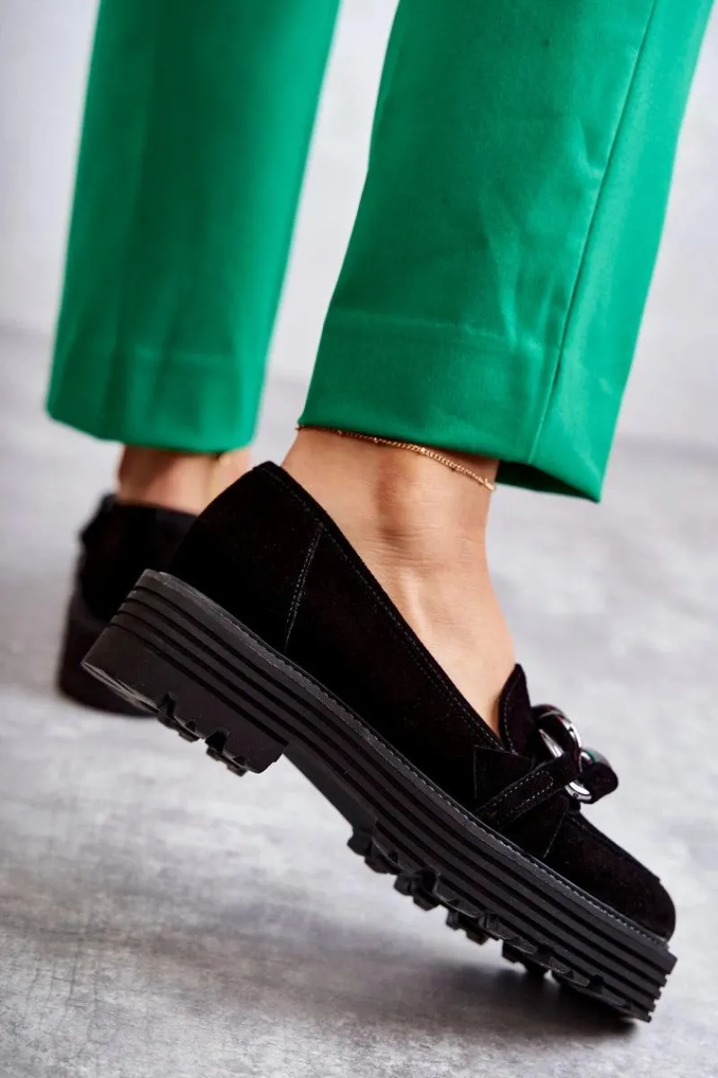 Klasyczne półbuty zostały wykonane z wysokiej jakości zamszowej skóry naturalnej. Na przodzie charakterystyczne zdobienie w postaci łańcucha z przeplatającym się paskiem z naturalnego zamszu. Buty te posiadają platformę oraz płaski obcas. Podeszwa ze żłobieniami świetnie odizoluje od nierównego podłoża. Świetny model do wielu stylizacji! Wygodne, a zarazem modne. Koniecznie musisz je mieć! Przy wyborze rozmiaru prosimy sugerować się tabelą rozmiarów.