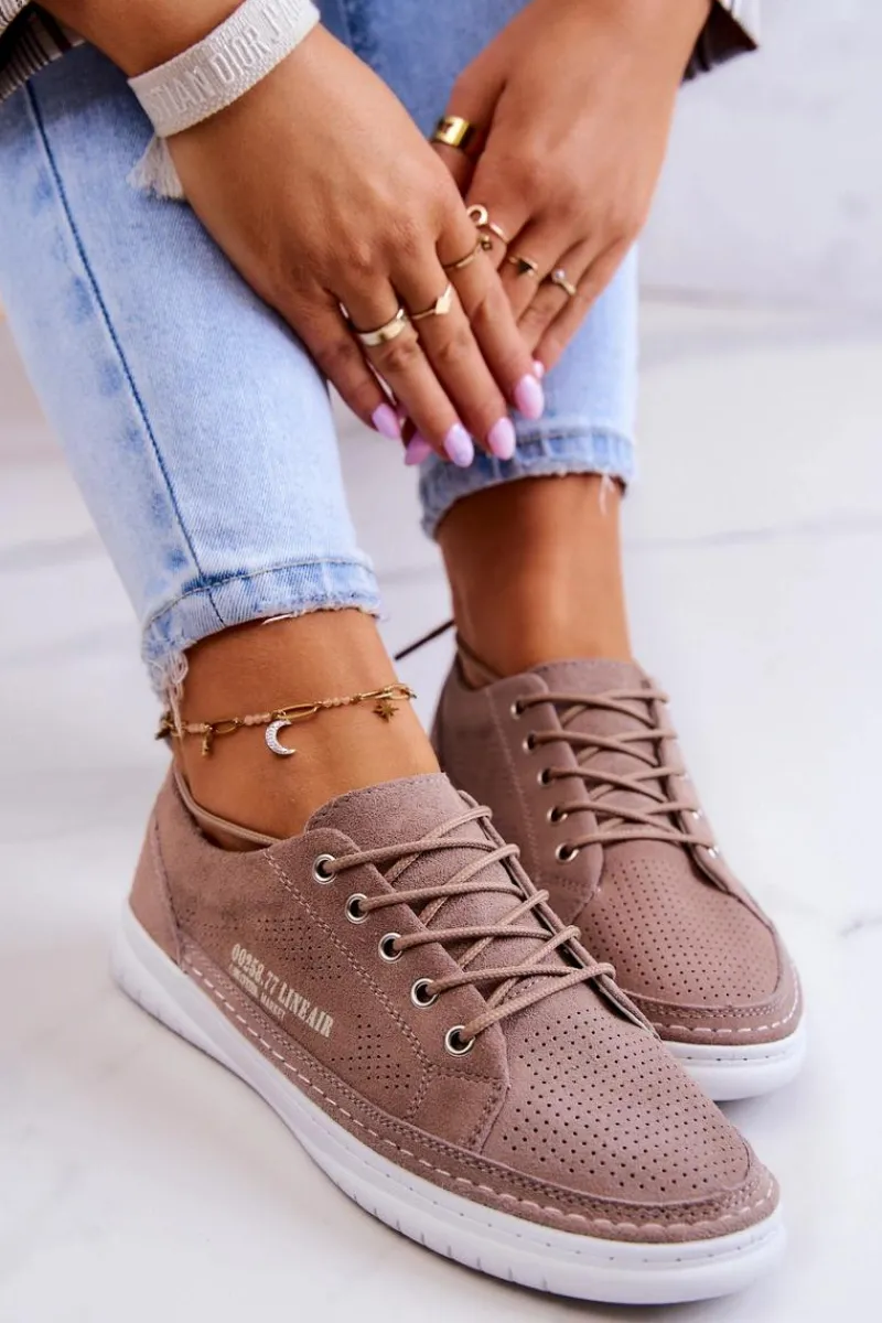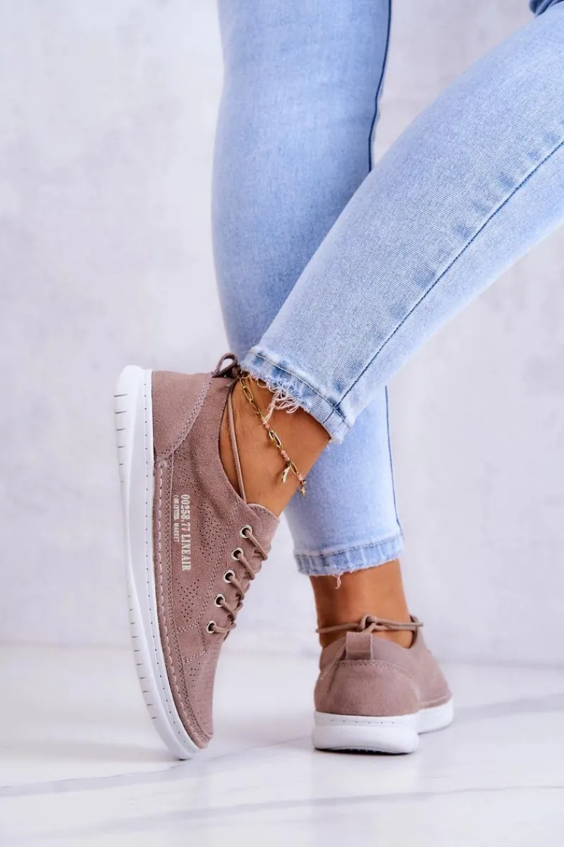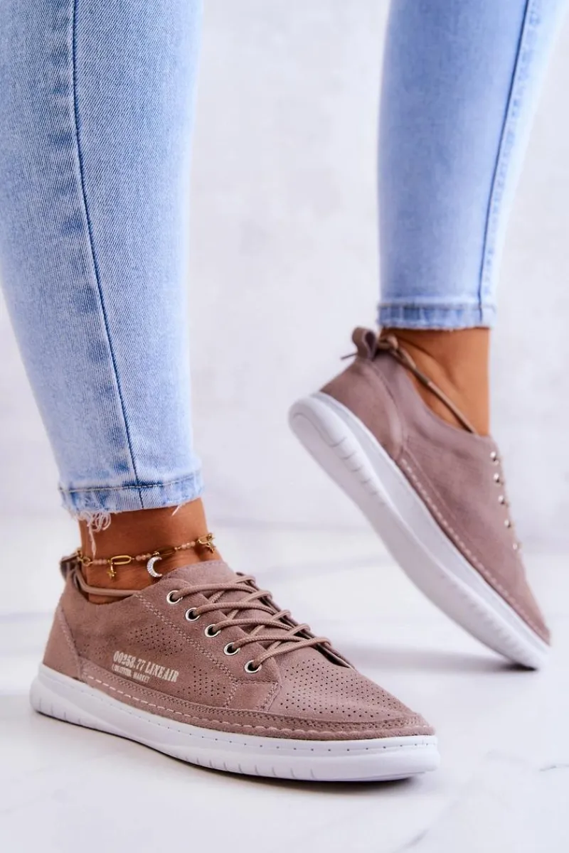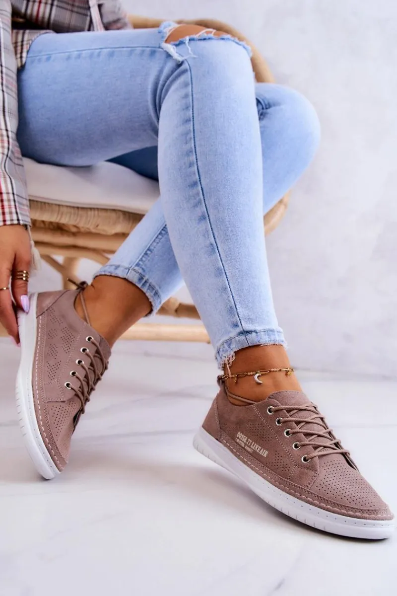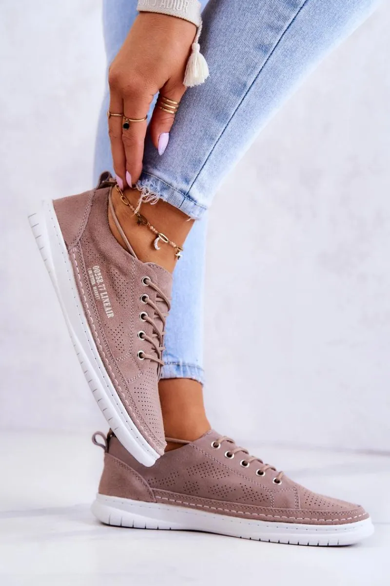 Tenisówki na podeszwie z gumowego tworzywa w klasycznym fasonie. Z niską cholewką przed kostkę. Model wiązany na okrągłe sznurowadła. Wykonane z naturalnej, miękkiej, zamszowej skóry z perforacją, co sprawia, że są niezwykle przewiewne i komfortowe w użytkowaniu. Wygodna wkładka jest także wykonana z naturalnej skóry. Będą doskonale pasować do codziennych stylizacji, zwłaszcza do jeansów czy szortów. Lekkie i modne – powinnaś mieć je w swojej szafie! Przy wyborze rozmiaru prosimy sugerować się tabelą rozmiarów.