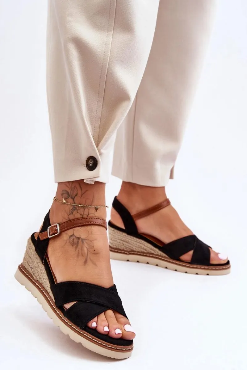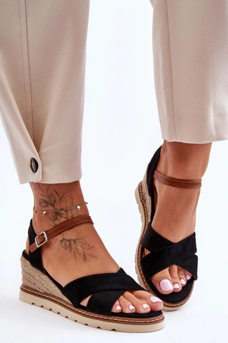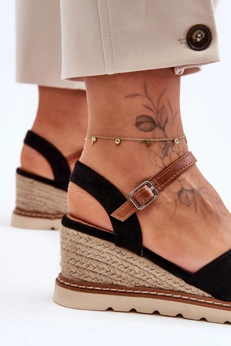 Damskie sandały na koturnie ozdobionym jutową plecionką zostały wykonane z eko zamszu. Model ten posiada delikatną platformę. Zapinane na regulowany paseczek ze sprzączką. Miękka wkładka w sandałkach pozwoli na komfortowe użytkowanie obuwia. Przy wyborze rozmiaru prosimy sugerować się tabelą rozmiarów.