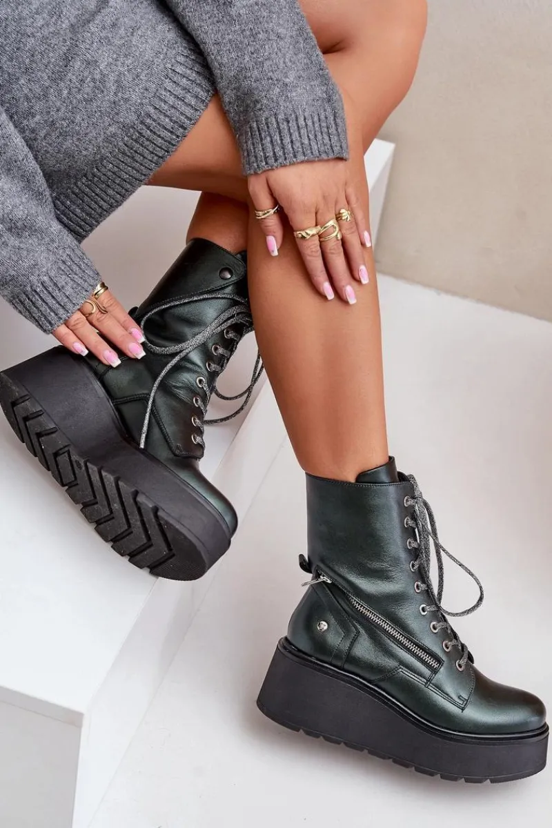 Botki workery marki Maciejka to wyjątkowy model, który łączy styl i funkcjonalność. Osadzone na koturnie i platformie, zapewniają wygodę i stabilność. Cholewka zapinana na zamek i zatrzask dodaje oryginalnego charakteru, a zaokrąglone noski zwiększają komfort noszenia. Wnętrze lekko ocieplane kocem obuwniczym, dzięki czemu sprawdzą się doskonale w chłodniejsze dni. Idealne do codziennych, casualowych stylizacji. Przy wyborze rozmiaru prosimy sugerować się tabelą rozmiarów.
