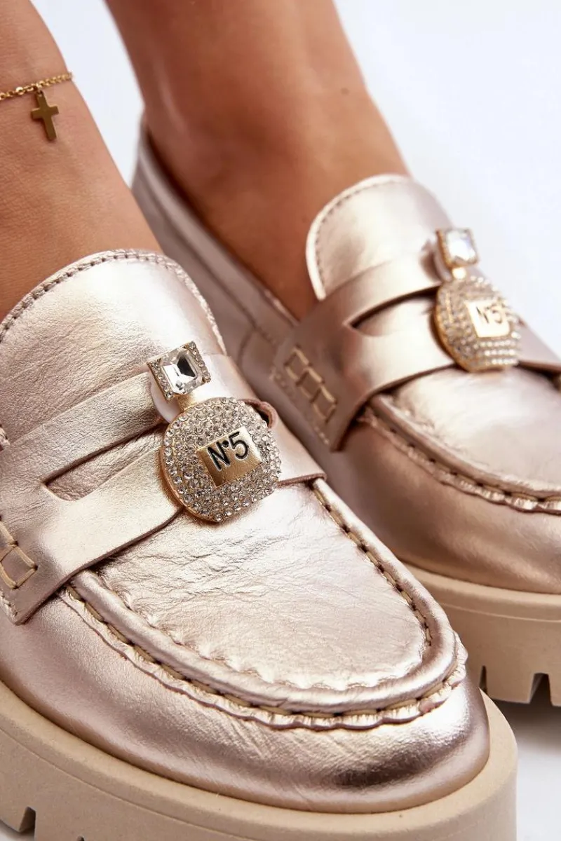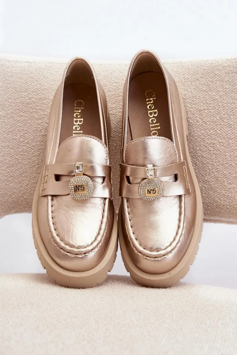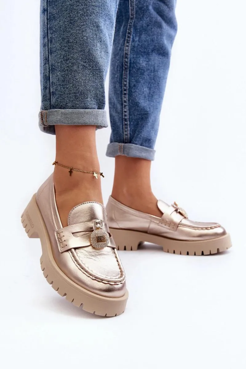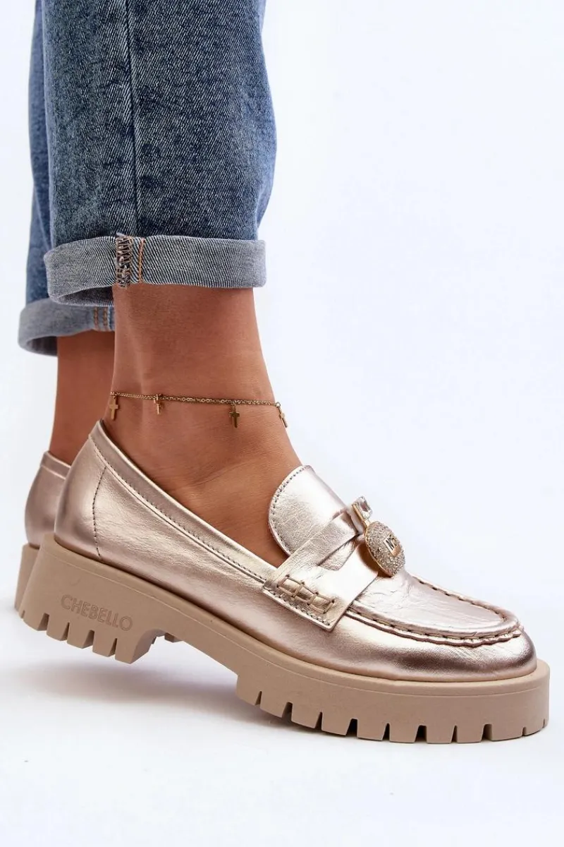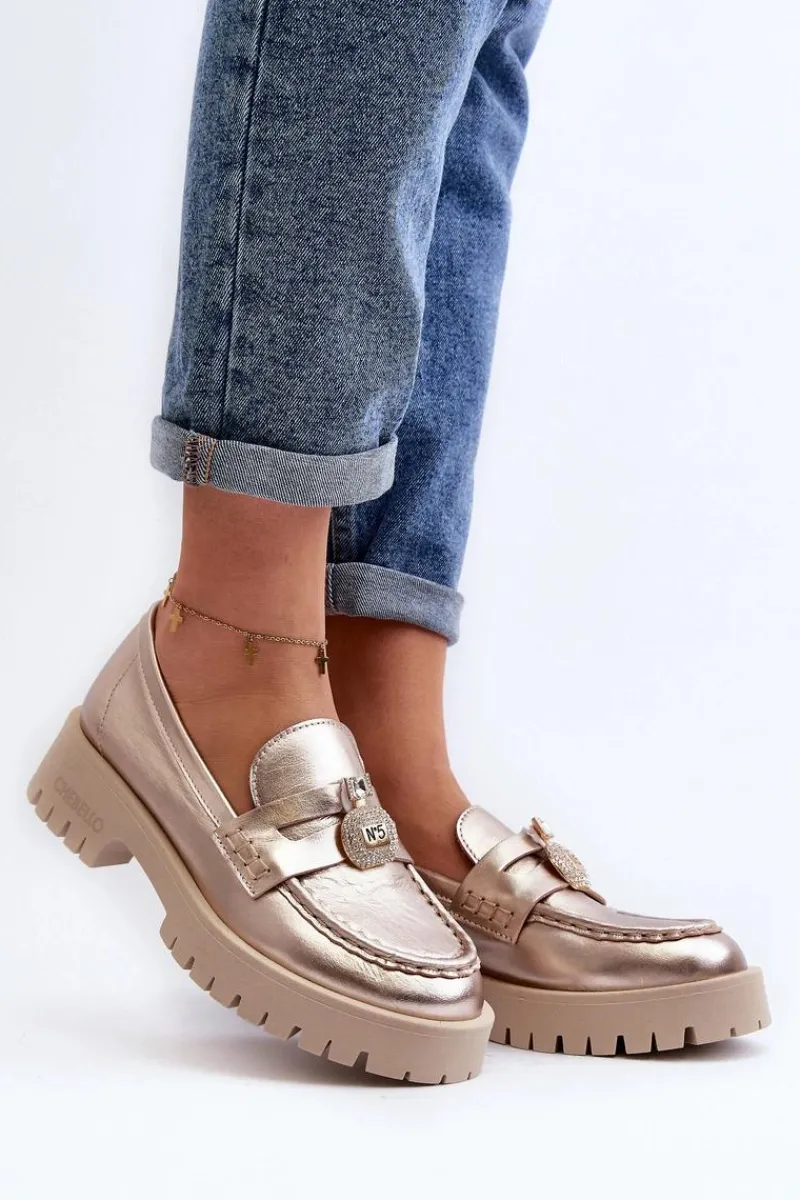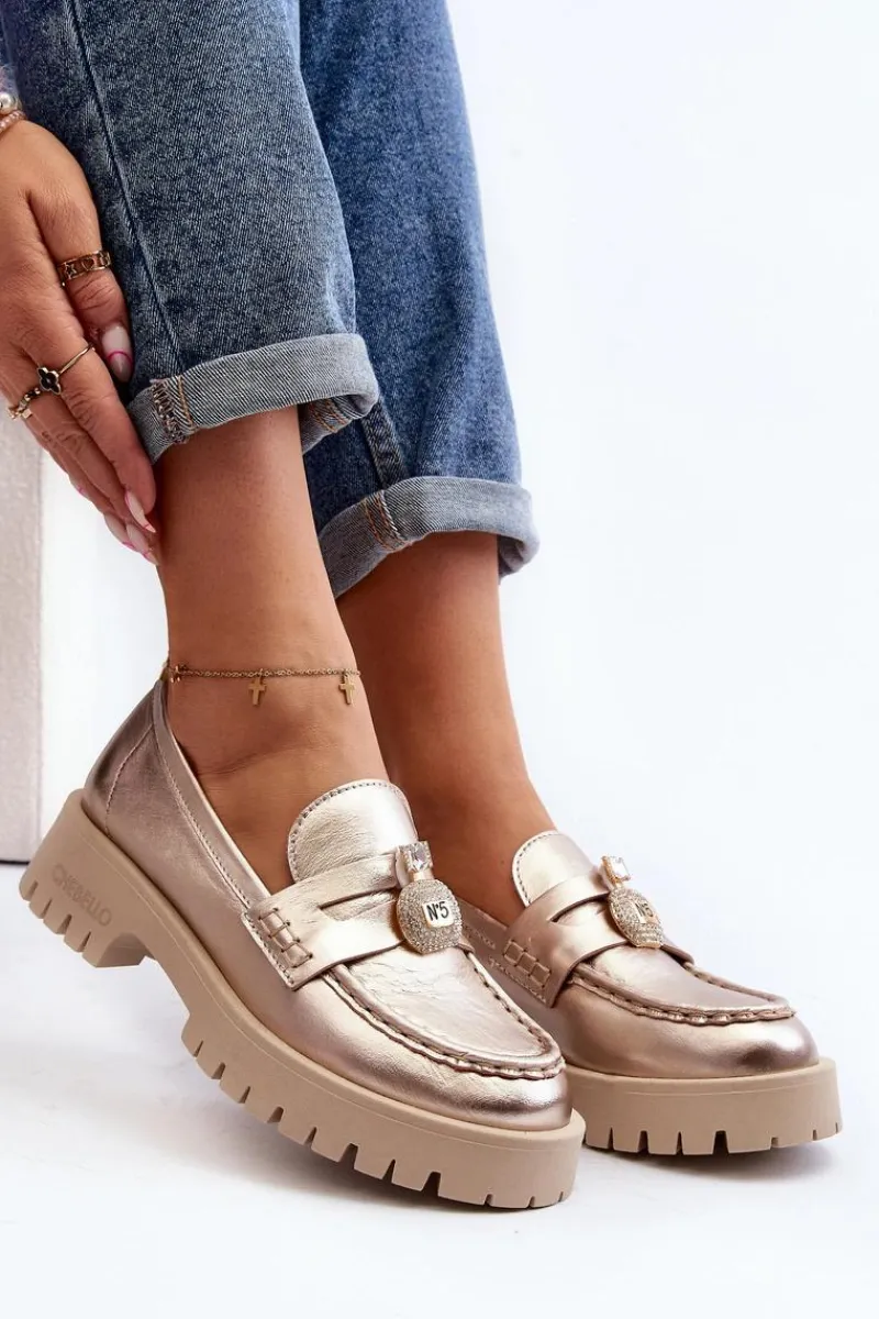 Piękne, damskie mokasyny wykonane ze skóry naturalnej. Osadzone na płaskim, masywnym obcasie. Skórzana wkładka w tych mokasynach jest miękka i wygodna podczas użytkowania. Model ten posiada ozdobę na pasku. Fason ten idealnie sprawdzi się w codziennych stylizacjach! Przy wyborze rozmiaru prosimy sugerować się tabelą rozmiarów.