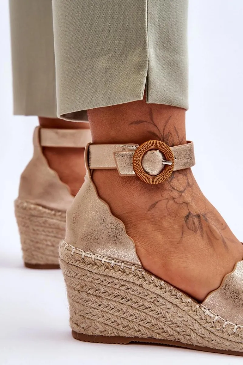 Damskie sandałki osadzone na platformie i koturnie. Dodatkowo zostały ozdobione jutową plecionką. Wykonane z wysokiej jakości eko skóry. Sandałki posiadają ozdobne wykończenie cholewki w postaci falbanki. Model ten jest zapinany na regulowany pasek ze sprzączką. Miękka wkładka typu Comfort z efektem poduszki jest niezwykle wygodna podczas użytkowania. Przy wyborze rozmiaru prosimy sugerować się tabelą rozmiarów.