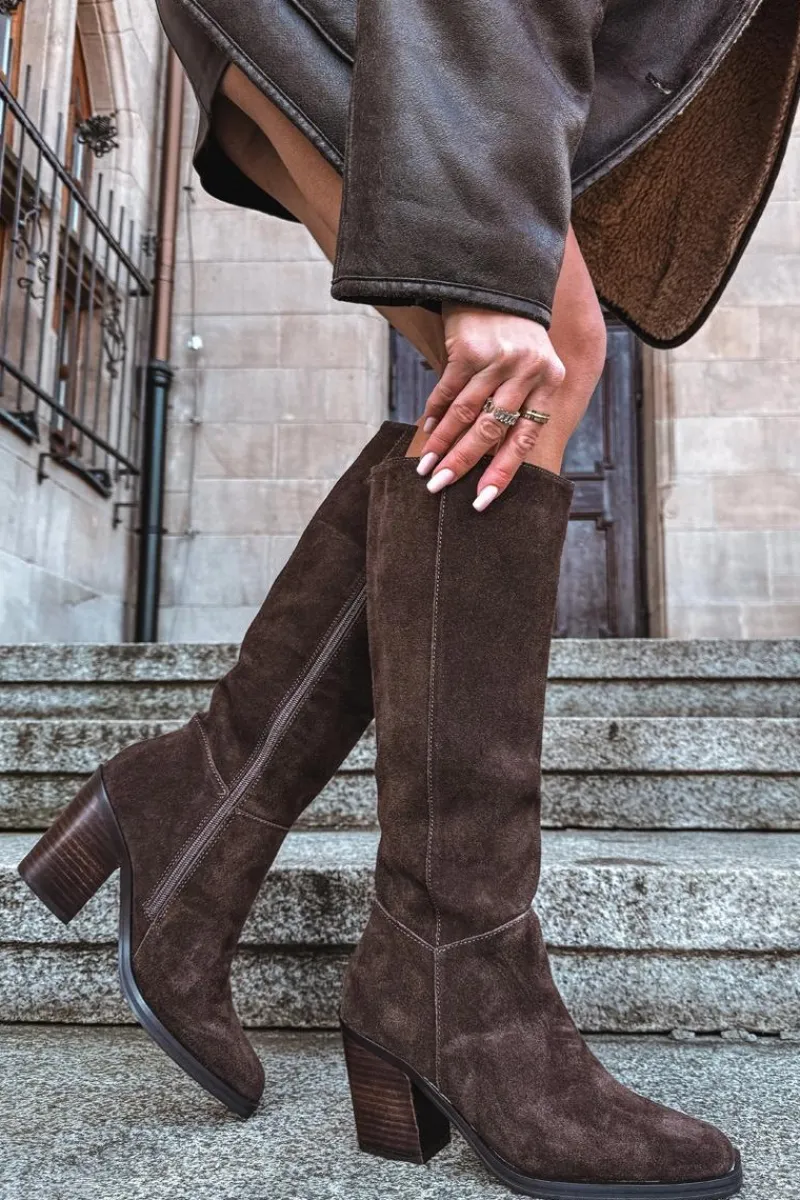 Zamszowe kozaki na słupku z zamkiem czekoladowe Lissara