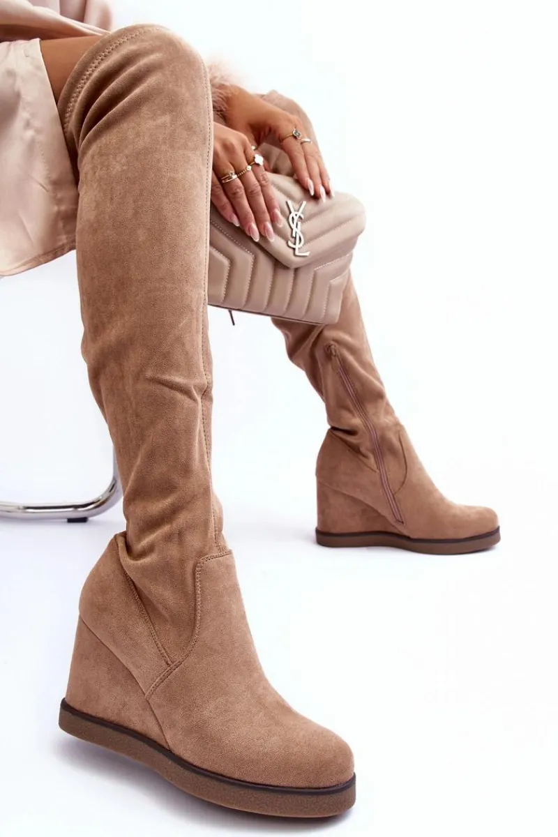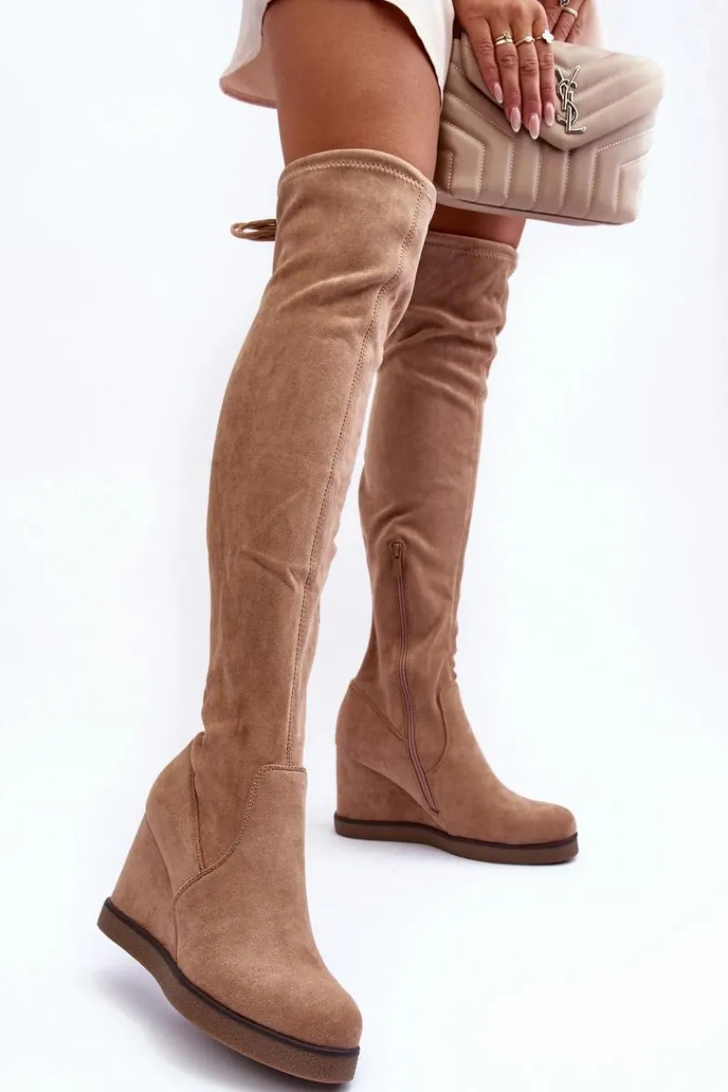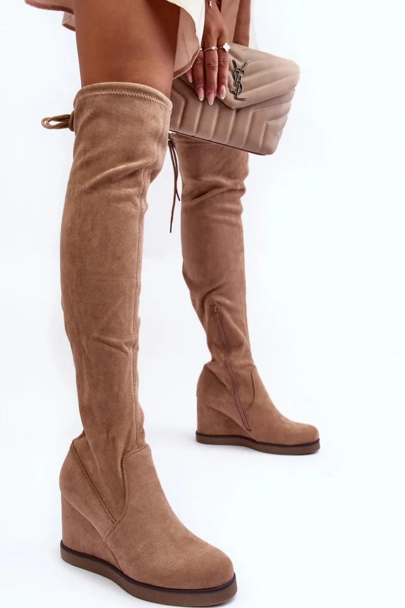 Kozaki damskie z wiązaną cholewką za kolano. Model wsuwany, z dodatkowym suwakiem z boku cholewki. Osadzone na koturnie i platformie. Ocieplenie na wysokości stopy. Zapiętek jest usztywniony. Ten wyjątkowy fason zachwyci każdego! Przy wyborze rozmiaru prosimy sugerować się tabelą rozmiarów.