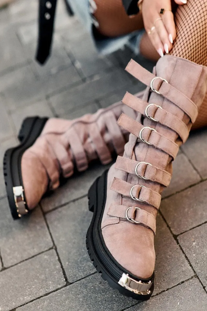 Wysokie workery damskie osadzone na płaskim obcasie oraz platformie. Zapinane na suwak po wewnętrznej stronie cholewki. Wykonane z eko zamszu. Noski zaokrąglone. Z przodu regulowane paseczki. Usztywniony zapiętek pozwoli na odpowiednią stabilizację stopy. Środek ocieplony kocem obuwniczym. Przy wyborze rozmiaru prosimy sugerować się tabelą rozmiarów.