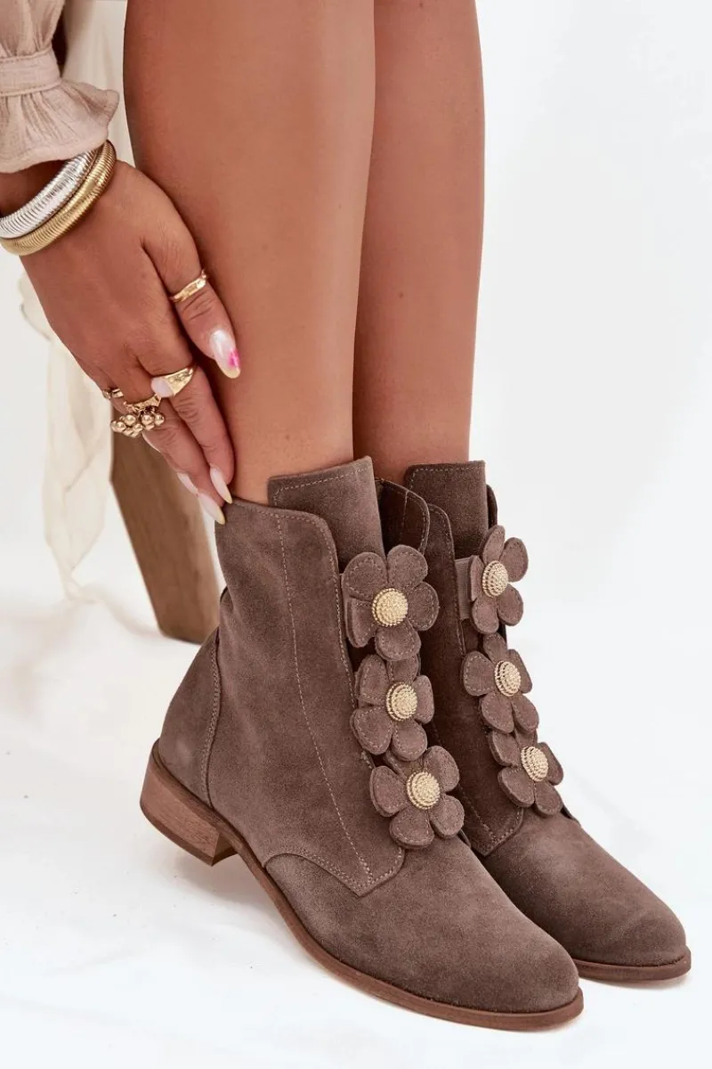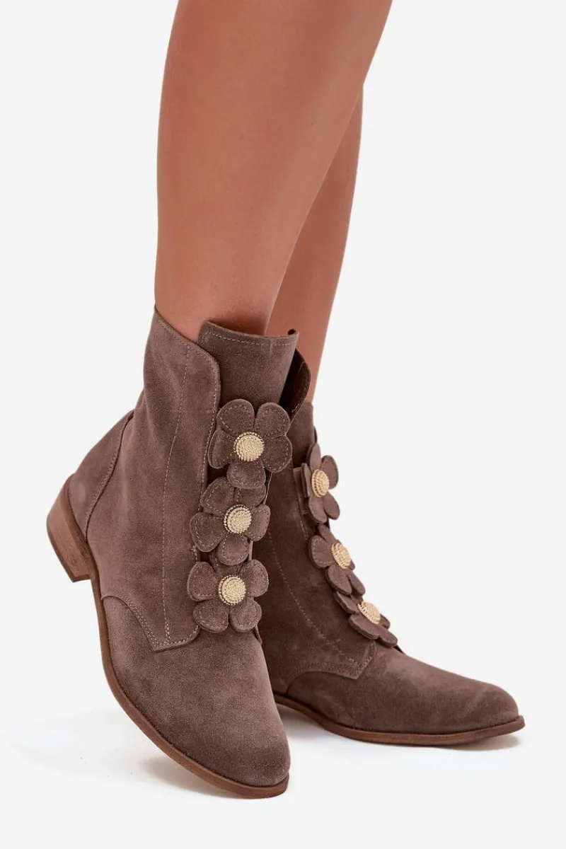 Botki damskie z naturalnego zamszu to doskonały wybór dla kobiet ceniących elegancję i subtelność. Wykonane z wysokiej jakości materiału, oferują nie tylko estetyczny wygląd, ale także komfort noszenia przez cały dzień. Zapinane na zamek błyskawiczny. Przód buta ozdobiony jest pięknymi, urokliwymi kwiatkami, które nadają im niepowtarzalnego, delikatnego charakteru. Dzięki temu stanowią doskonały dodatek do zarówno codziennych, jak i bardziej eleganckich stylizacji. Świetnie komponują się z sukienkami, spódnicami czy spodniami. Przy wyborze rozmiaru prosimy sugerować się tabelą rozmiarów.