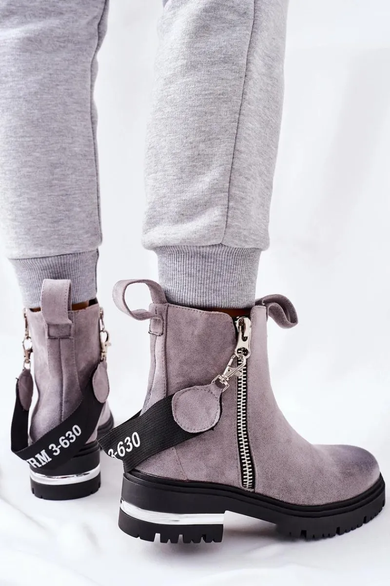 Botki damskie wykonane z eko zamszu. Wnętrze ocieplone jest miłym w dotyku kocem obuwniczym. Przy wyborze rozmiaru prosimy sugerować się tabelą rozmiarów.