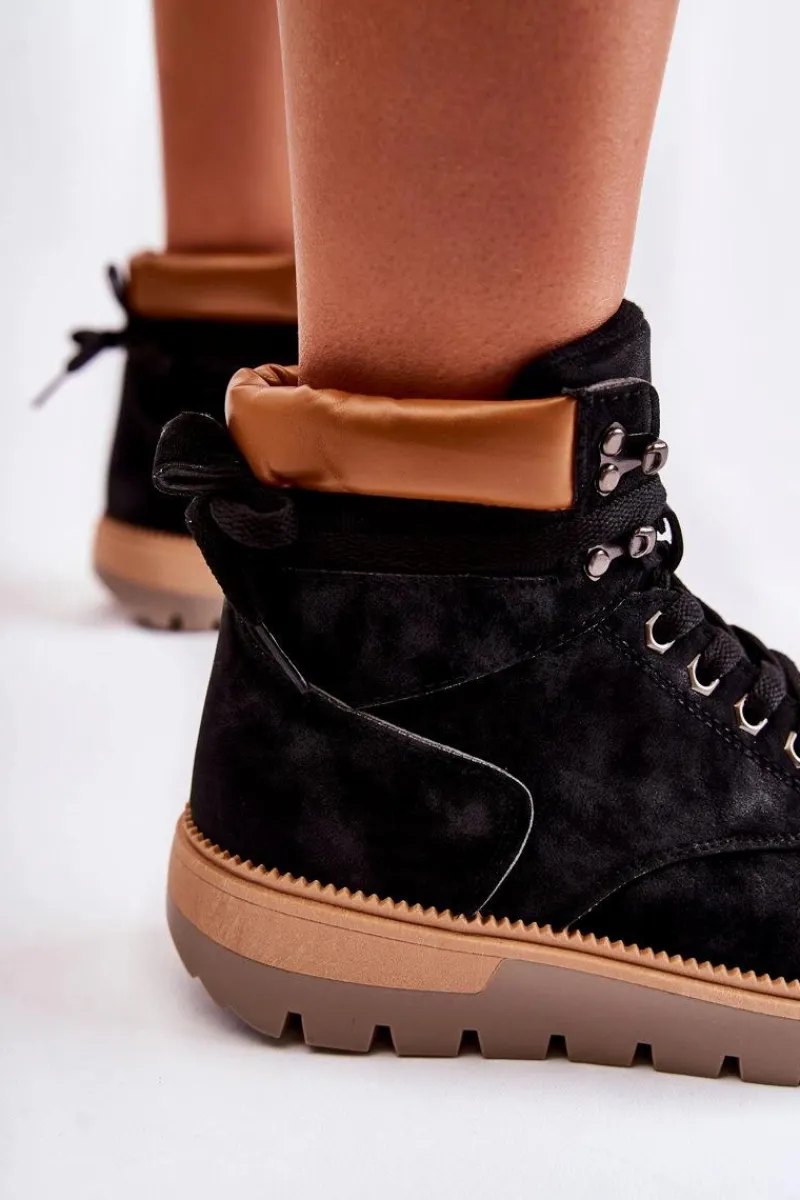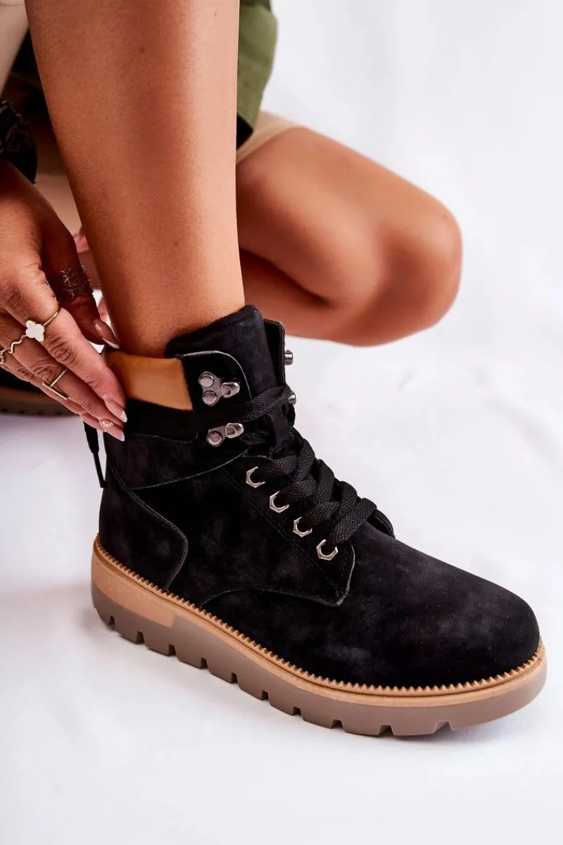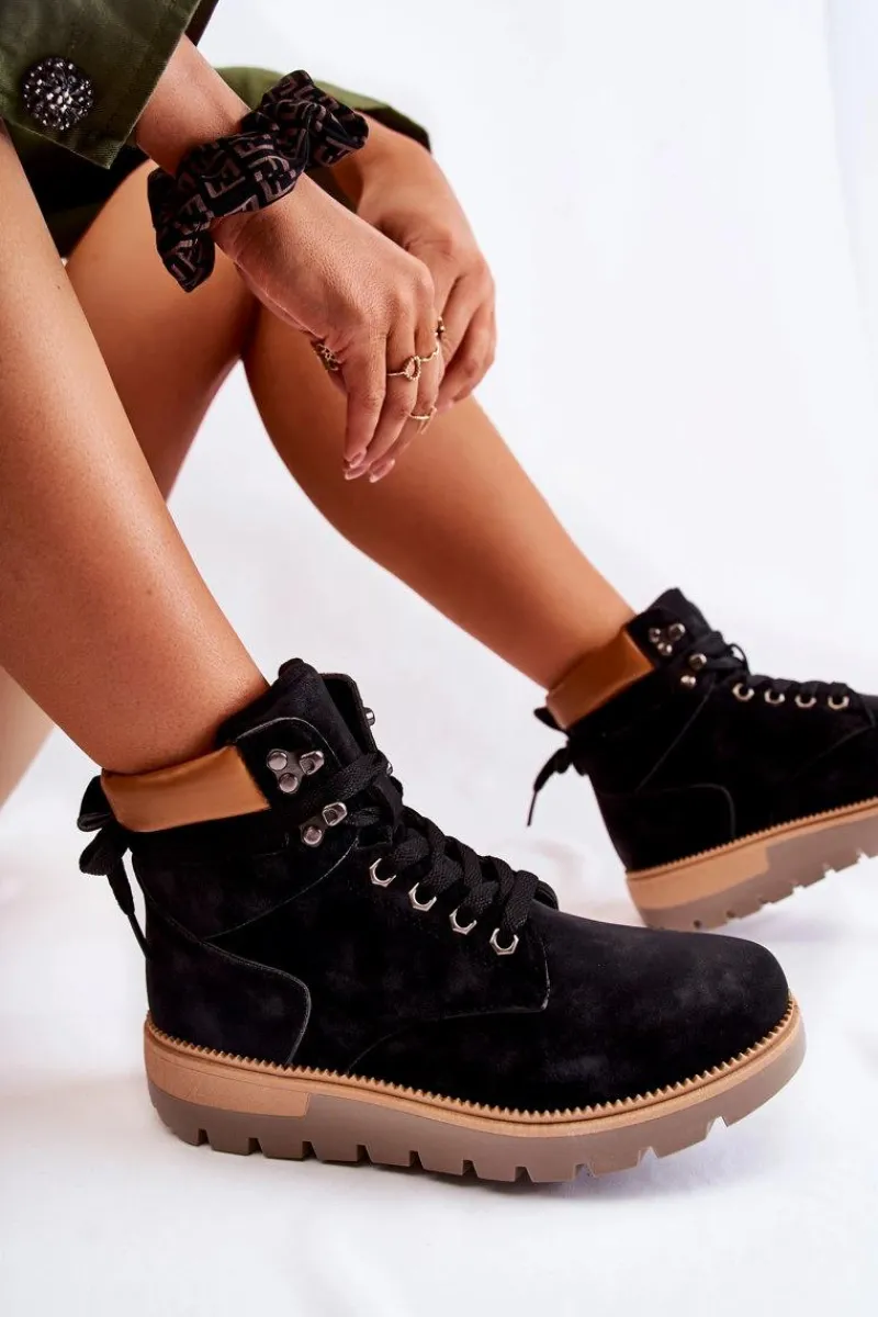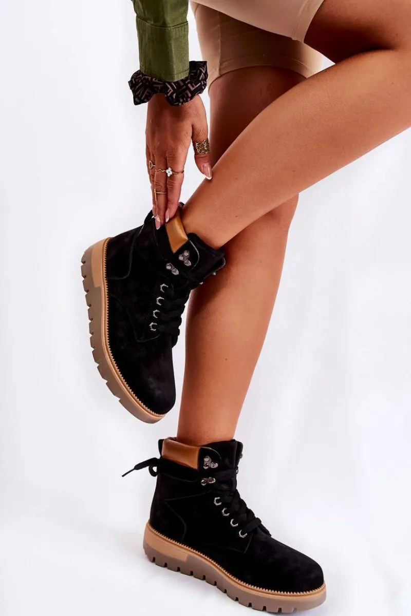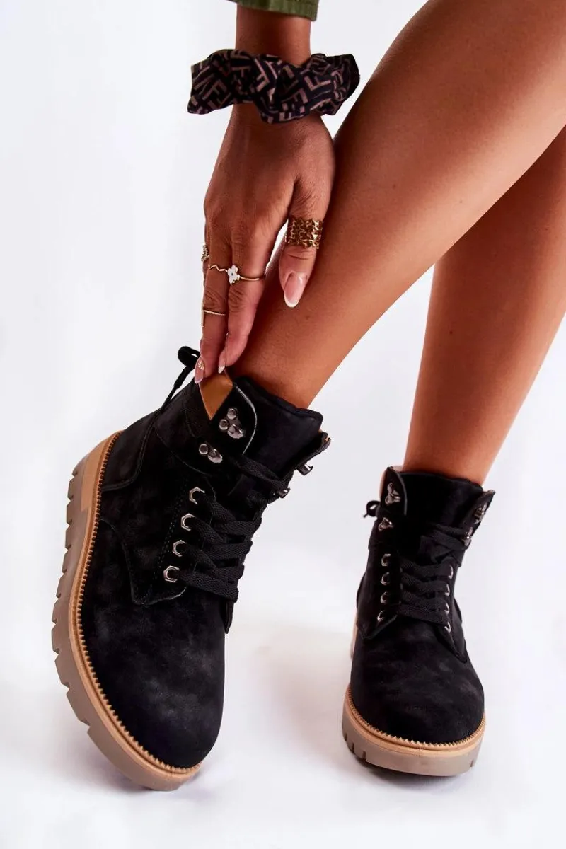 Botki damskie zostały wykonane z eko skóry. Model osadzony jest na platformie z charakterystycznymi żłobieniami. Posiadają zaokrąglony nosek. Cholewka zakrywająca kostkę z małą pętelką z tyłu ułatwiającą zakładanie obuwia. Wkładka oraz wyściółka ocieplone kocem obuwniczym. Klasyczne wiązanie na płaskie sznurowadła pozwoli na odpowiednie dopasowanie obuwia do tęgości nogi. Przy wyborze rozmiaru prosimy sugerować się tabelą rozmiarów.