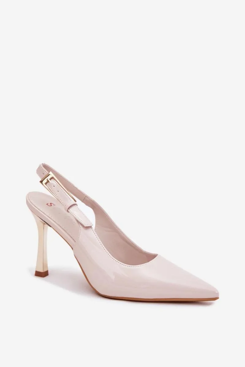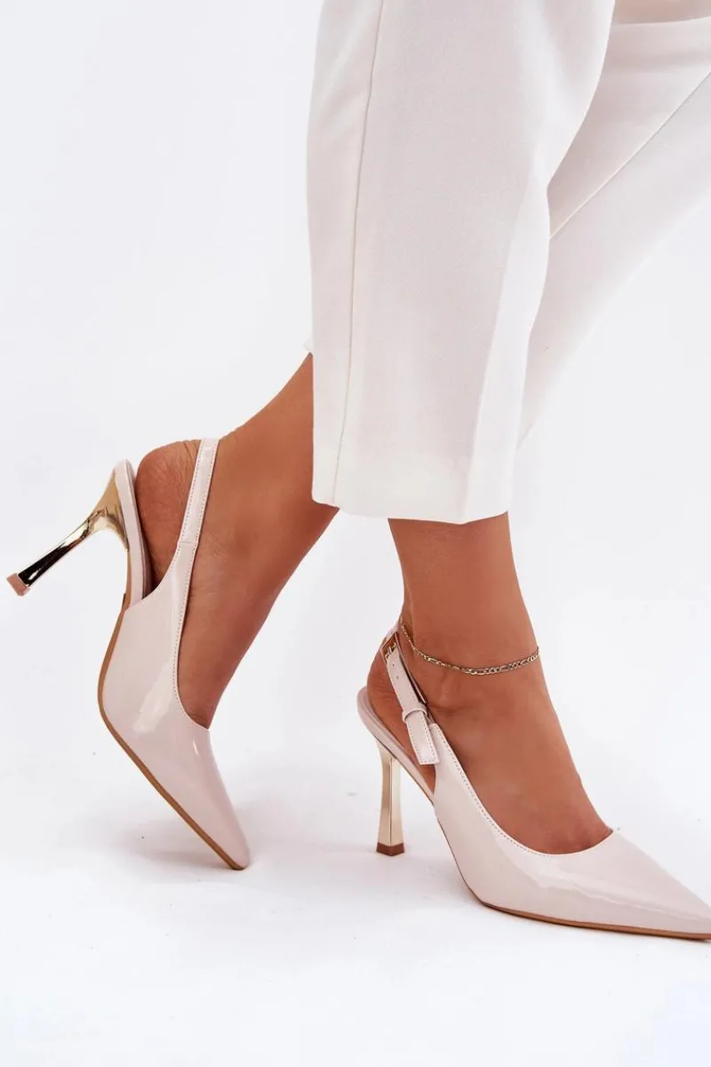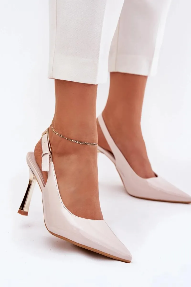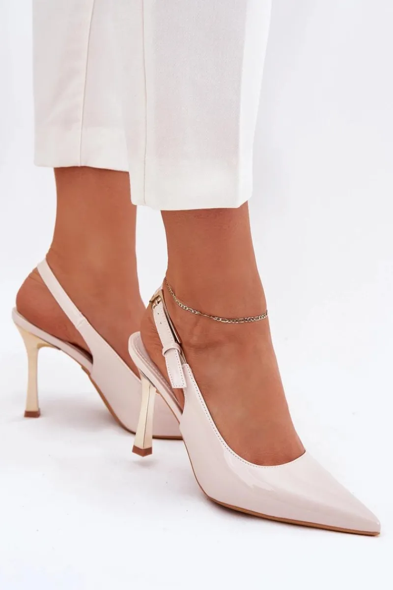 Lakierowane eleganckie szpilki z odkrytą piętą to połączenie klasyki i nowoczesności. Szpiczaste noski optycznie wysmuklają nogi, a zapinane na regulowany pasek ze sprzączką, zapewniają idealne dopasowanie i stabilność. Te szpilki doskonale sprawdzą się na specjalne okazje, łącząc elegancję z subtelnym, ale wyrazistym stylem. Idealne do wieczorowych stylizacji, dodają szyku i pewności siebie. Przy wyborze rozmiaru prosimy sugerować się tabelą rozmiarów.