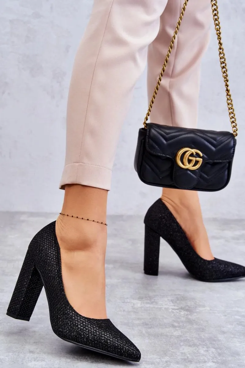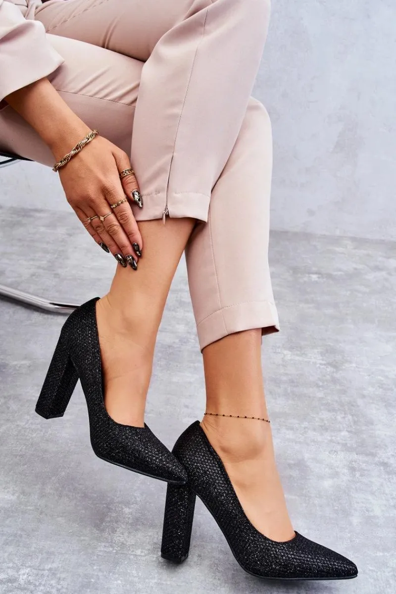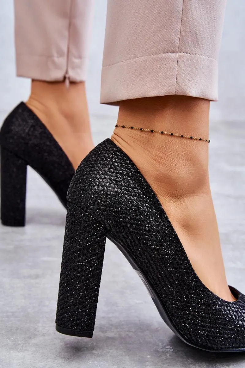 Klasyczne czółenka zostały wykonane z błyszczącego materiału o ciekawym splocie. Idealny model na różnego rodzaju imprezy czy okolicznościowe spotkania. Nosek w szpic oraz obcas w postaci słupka optycznie wysmukli nogi. Wkładka została wykonana z miękkiej eko skóry, co zwiększa komfort użytkowania obuwia. Przy wyborze rozmiaru prosimy sugerować się tabelą rozmiarów.