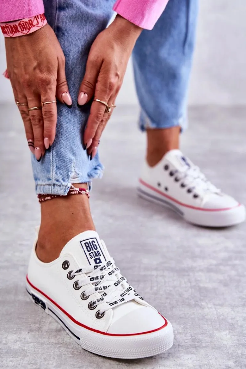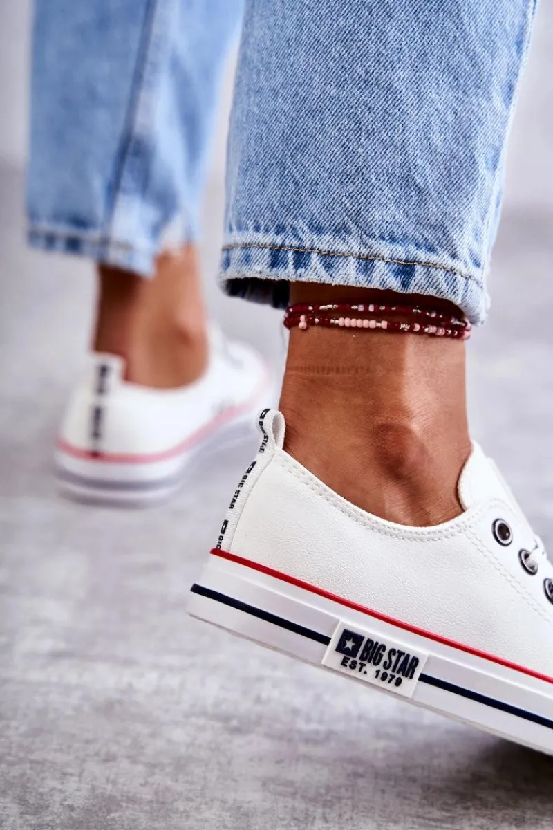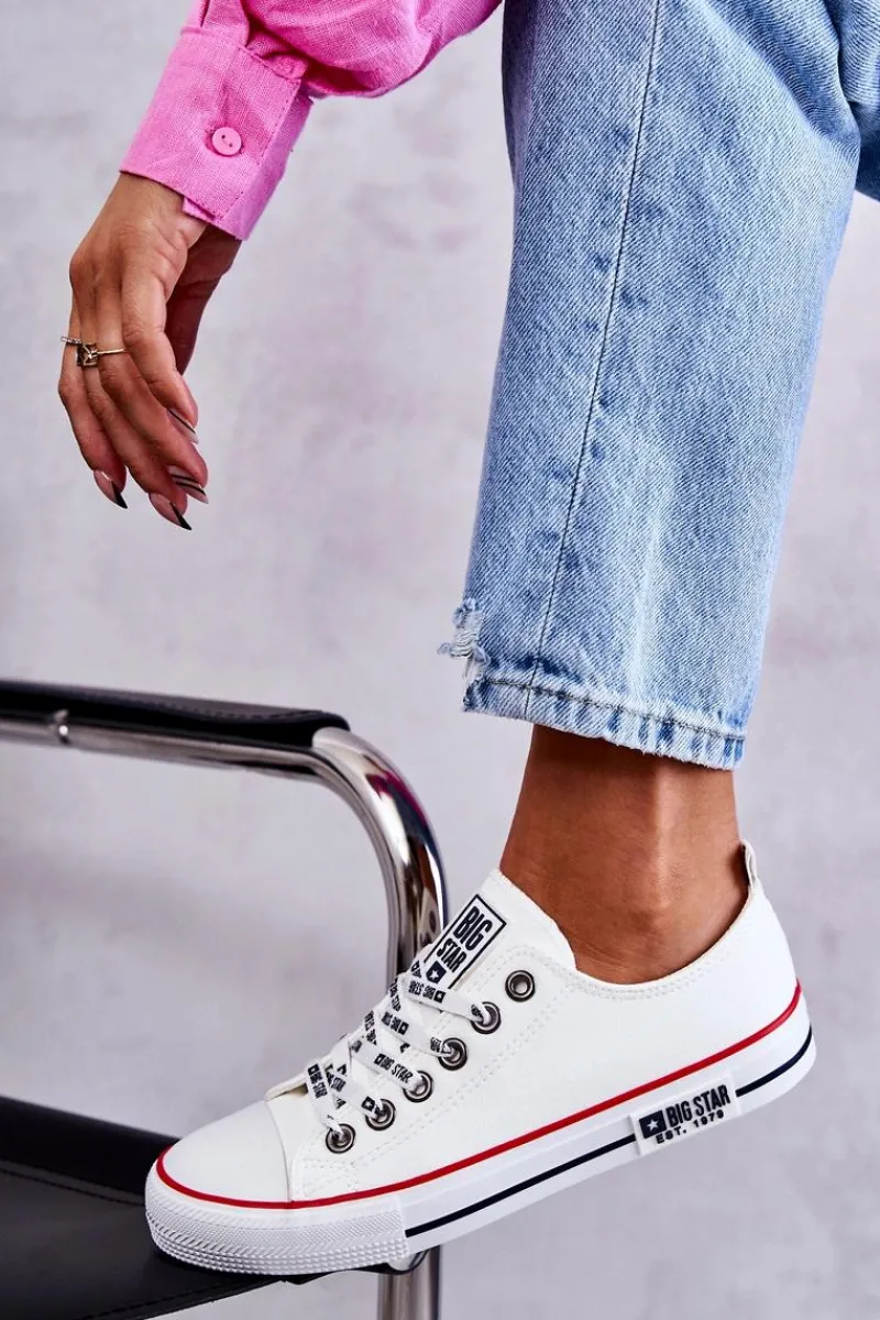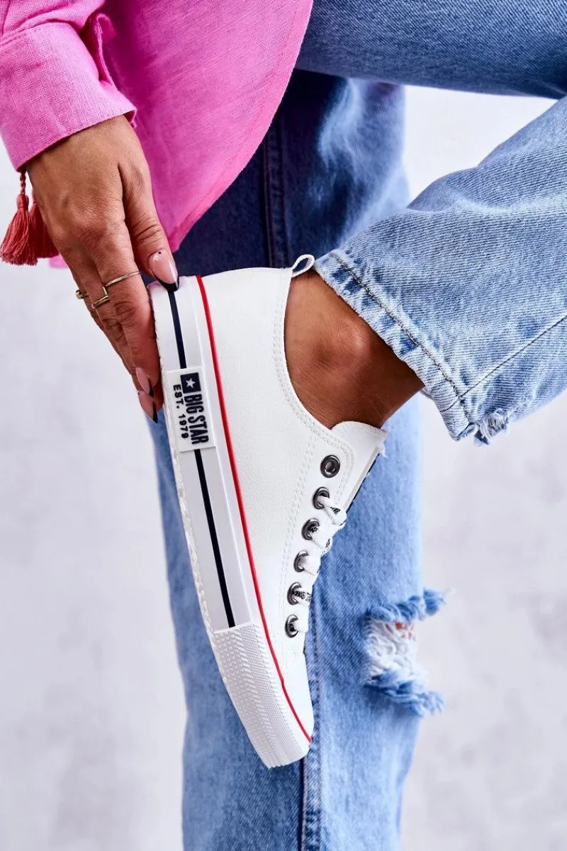 Ponadczasowe trampki damskie marki Big Star zostały wykonane z eko skóry. Posiadają gumowy, wzmacniany nosek. Model charakteryzuje się logowanymi sznurowadłami. Podeszwa wraz z platformą wykonane z gumowego tworzywa, dzięki którym model ten jest antypoślizgowy. Wkładka materiałowa. Klasyczne trampki z pewnością świetnie będą prezentować się w wielu stylizacjach. Przy wyborze rozmiaru prosimy sugerować się tabelą rozmiarów.