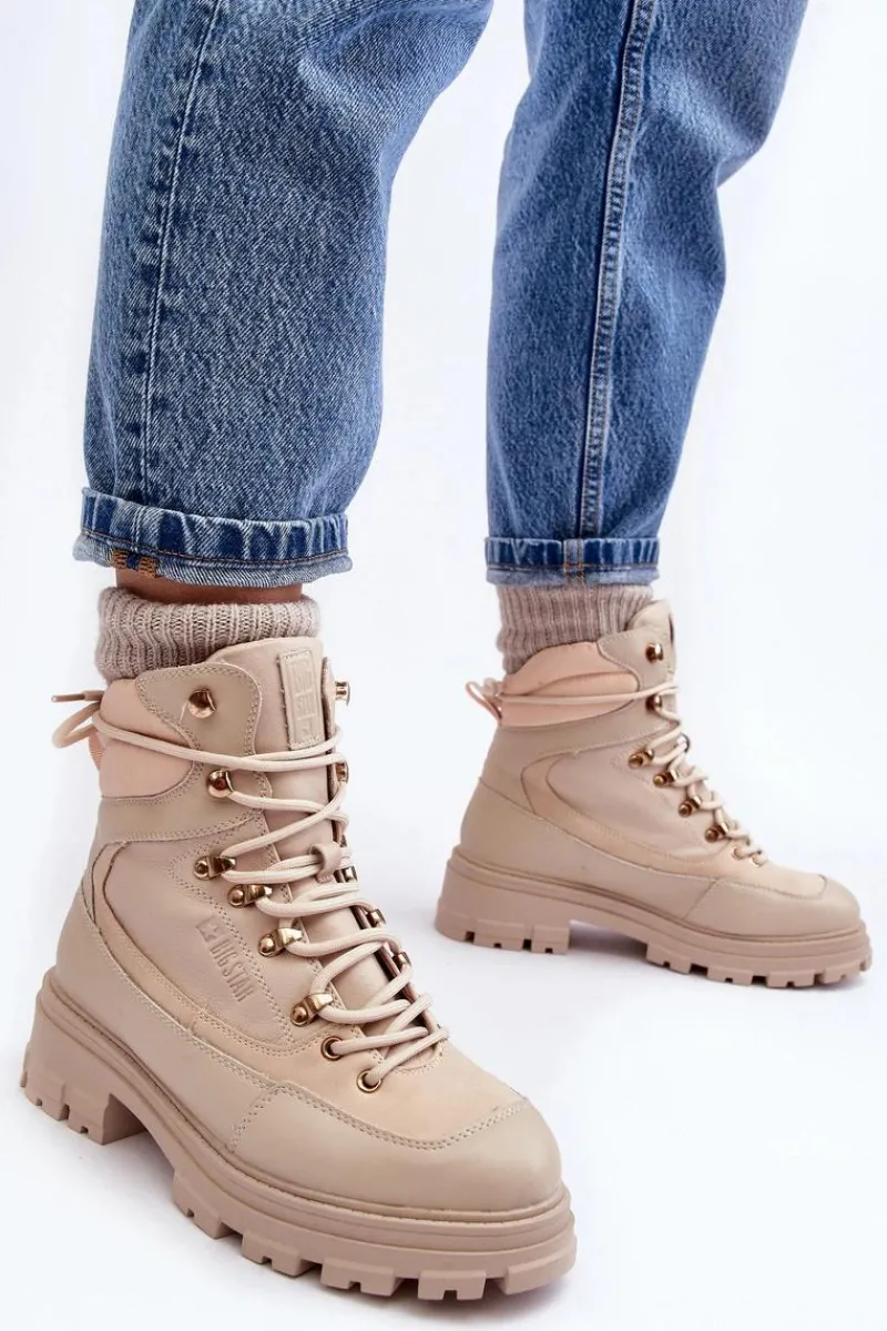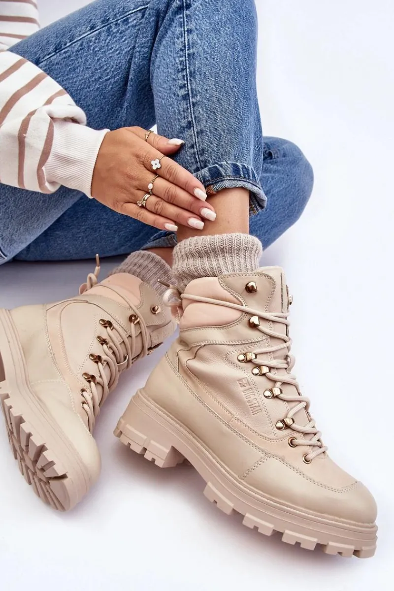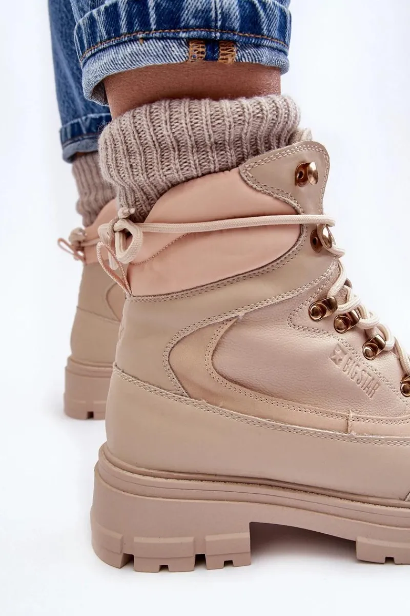 Damskie botki — trapery marki Big Star zostały wykonane z eko skóry. Osadzone na płaskim obcasie oraz platformie z gumowego tworzywa. Model klasycznie sznurowany. Środek ocieplony kocem obuwniczym. Zapiętek jest usztywniony. Noski zaokrąglone. Przy wyborze rozmiaru prosimy sugerować się tabelą rozmiarów.