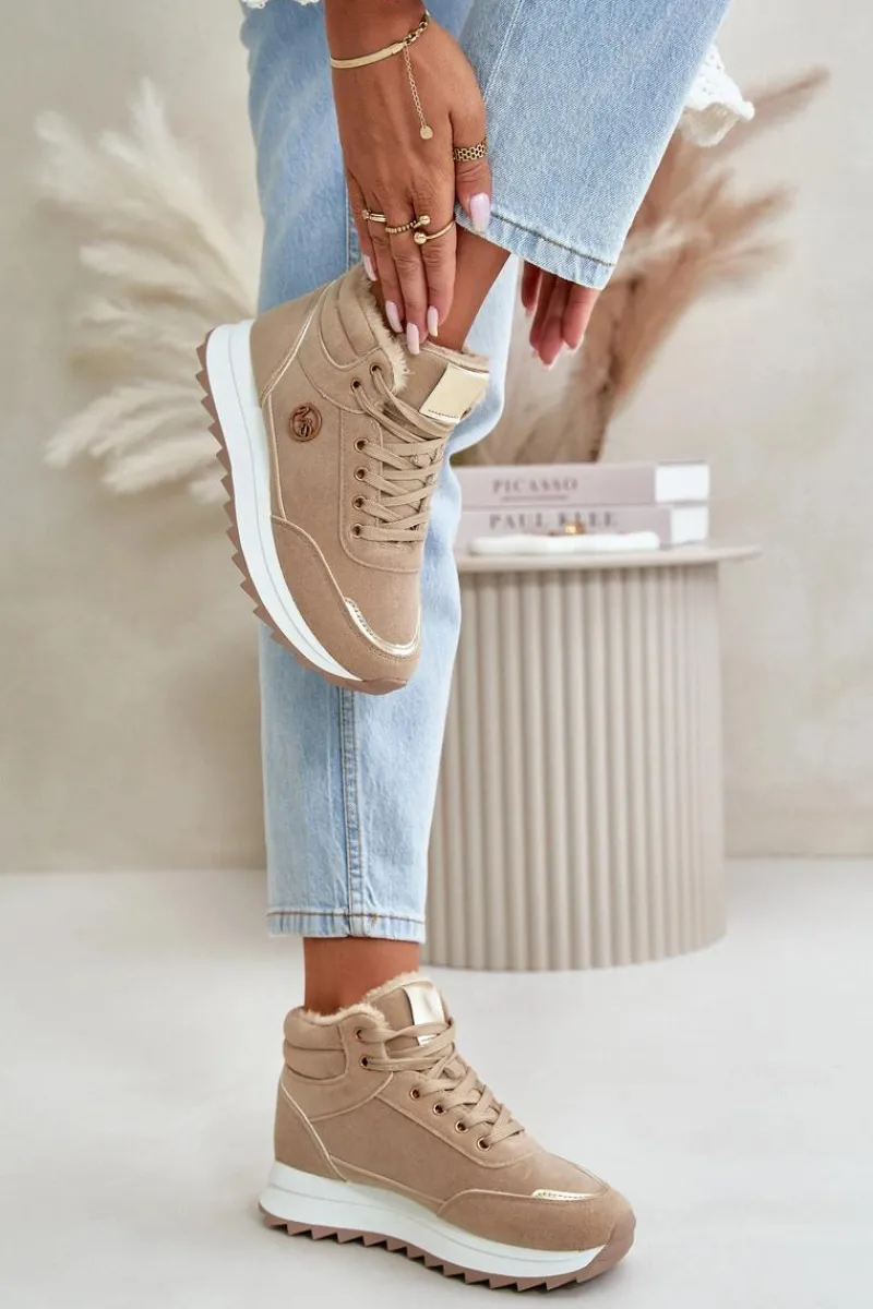 Botki damskie w sportowym stylu, idealne na chłodniejsze dni. Osadzone na masywnej platformie, zapewniają wygodę i stabilność podczas chodzenia. Wnętrze butów ocieplone jest ciepłym i miłym w dotyku futerkiem, które skutecznie chroni przed zimnem. Model sznurowany, co umożliwia dokładne dopasowanie buta do stopy. Dodatkowym atutem są złote detale na cholewce, które nadają botkom eleganckiego charakteru. Te botki doskonale sprawdzą się zarówno w miejskich stylizacjach, jak i podczas długich spacerów. Przy wyborze rozmiaru prosimy sugerować się tabelą rozmiarów.