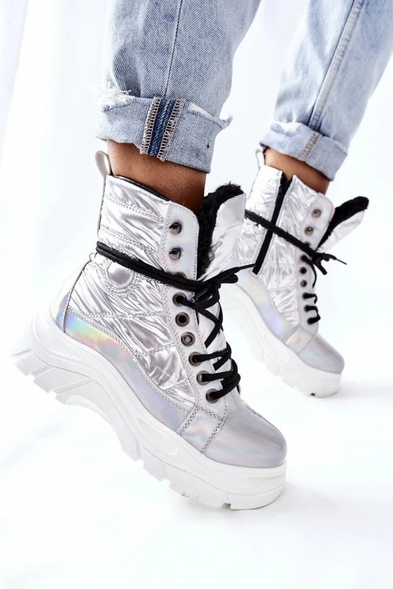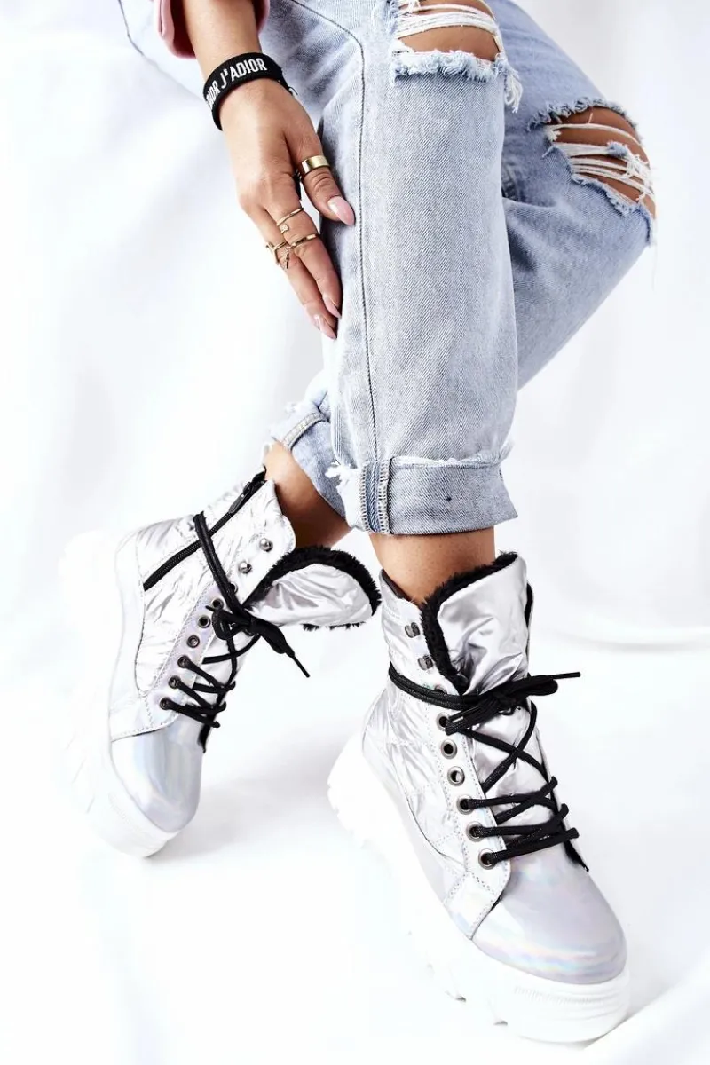 Damskie ocieplane botki wykonane ze skóry ekologicznej. Sznurowane oraz zapinane na zamek. Idealne na zimę.