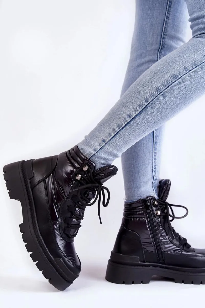 Damskie botki wykonane zostały z wysokiej jakości tkaniny oraz eko skóry. Model ten posiada suwak z boku cholewki oraz solidne sznurowanie. Trapery posiadają ocieplenie w postaci grubego futerka. Osadzone zostały na płaskim obcasie i platformie ze żłobieniami. Świetny model na chłodniejsze dni! Powinnaś go mieć w swojej szafie! Przy wyborze rozmiaru prosimy sugerować się tabelą rozmiarów.