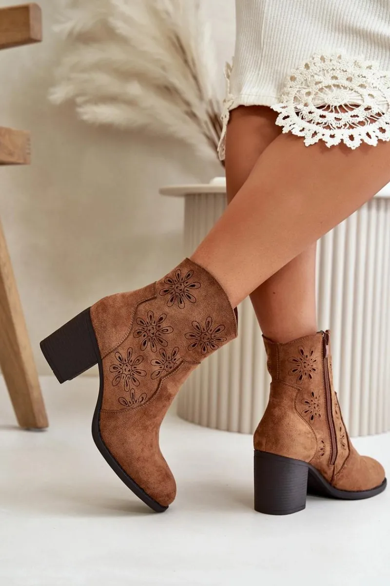 Botki damskie od marki Jezzi to doskonałe połączenie stylu i wygody, idealne na chłodniejsze dni. Model ten wyróżnia się eleganckim słupkowym obcasem, który zapewnia stabilność oraz subtelnie wydłuża sylwetkę. Zapinane na praktyczny zamek, botki są łatwe do zakładania i zdejmowania, co zwiększa komfort ich użytkowania. Ażurowa cholewka nadaje im unikalnego charakteru. Wkładka wykonana ze skóry naturalnej. Te stylowe botki doskonale komponują się zarówno z casualowymi, jak i bardziej eleganckimi stylizacjami. Przy wyborze rozmiaru prosimy sugerować się tabelą rozmiarów.