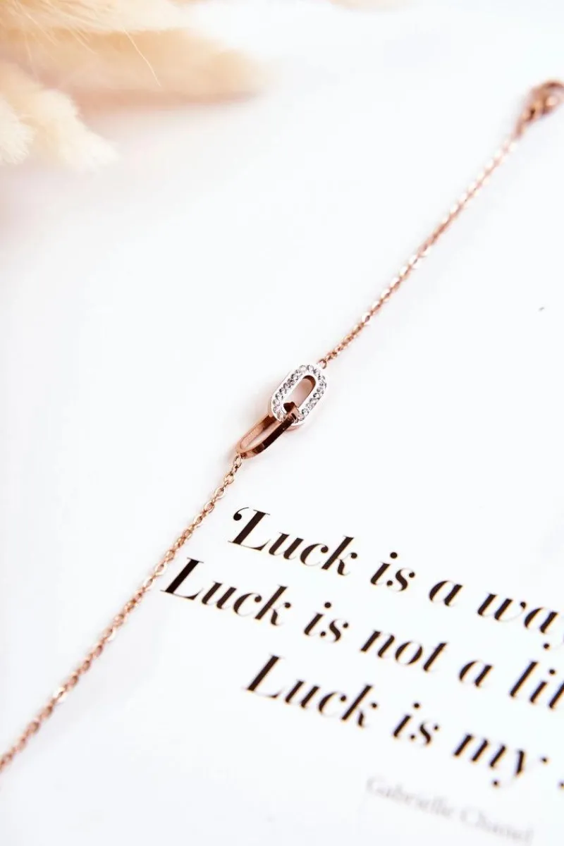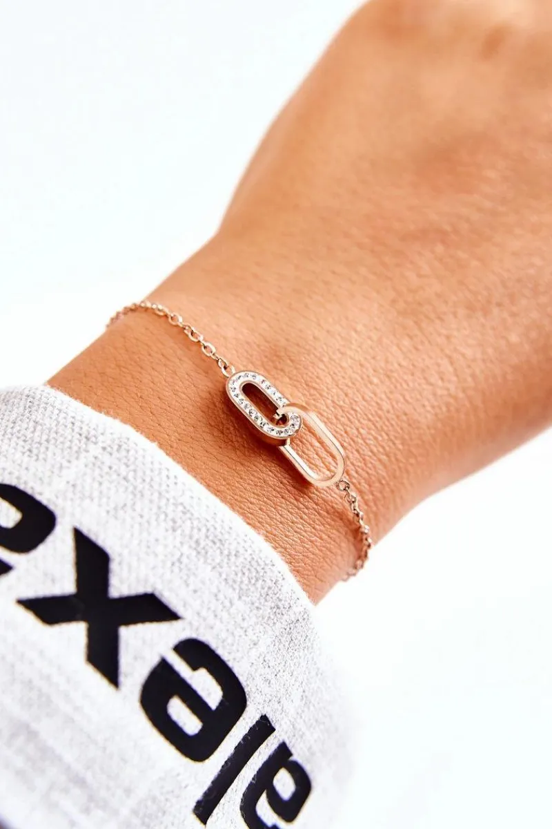 Damska bransoletka na cienkim łańcuszku typu celebrytka. Została wykonana ze stali nierdzewnej. Posiada możliwość regulacji długości. Na środku bransoletki znajduje się ozdoba w postaci dwóch owalnych elementów, z czego jeden jest przyozdobiony cyrkoniami. Taki rodzaj biżuterii jest świetnym dodatkiem do stylizacji nie tylko tych codziennych, ale i tych bardziej eleganckich. Model ten posiada klasyczne zapięcie. Koniecznie sprawdź także pozostałe modele biżuterii dostępnej w naszej ofercie!