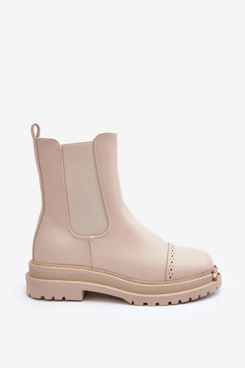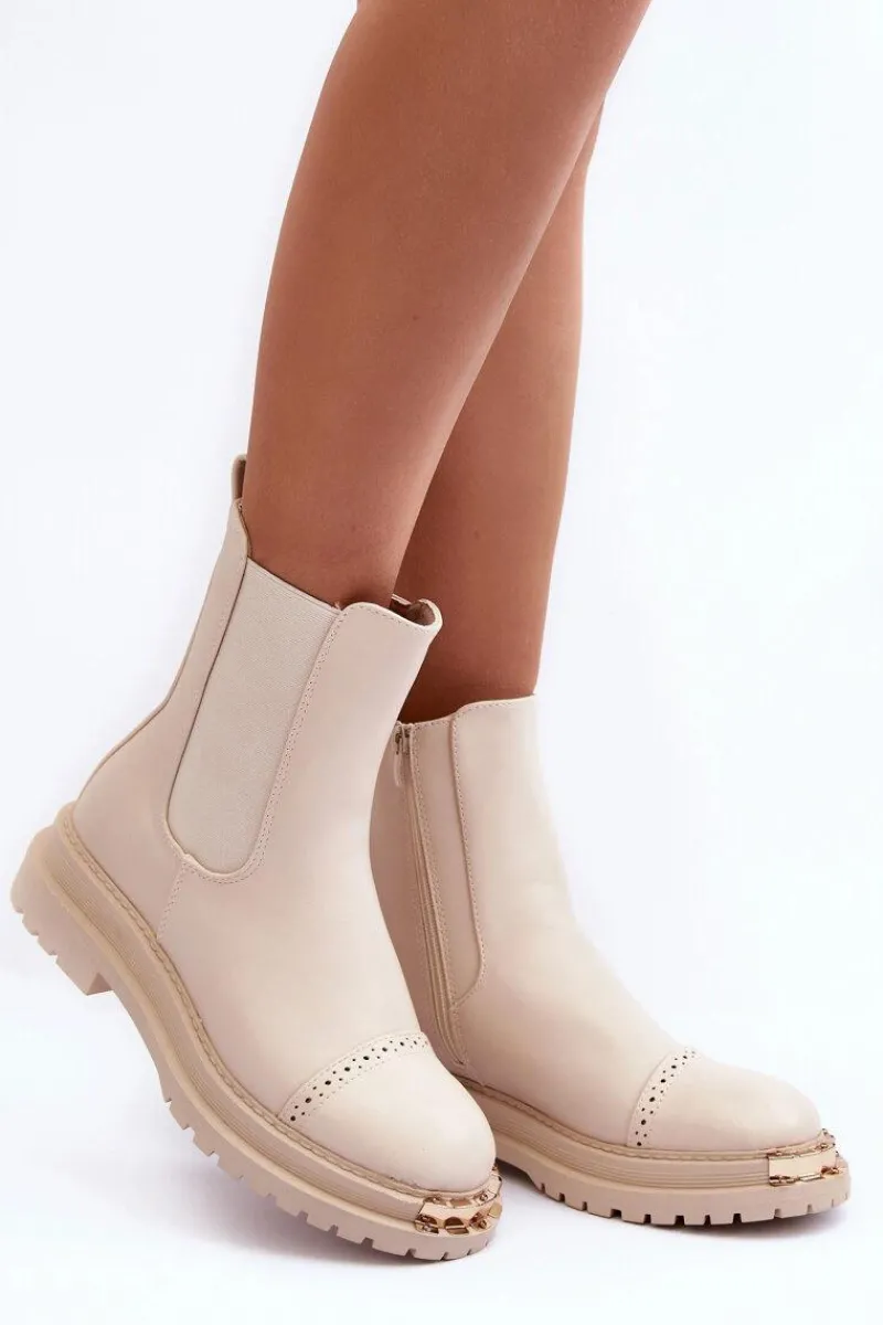 Damskie sztyblety zostały wykonane z eko skóry. Zapinane na suwak po wewnętrznej stronie cholewki. Osadzone na płaskim obcasie i platformie. Z przodu złota ozdoba z tworzywa sztucznego. Noski zaokrąglone. Ten model powinien znaleźć się w Twojej szafie! Przy wyborze rozmiaru prosimy sugerować się tabelą rozmiarów.