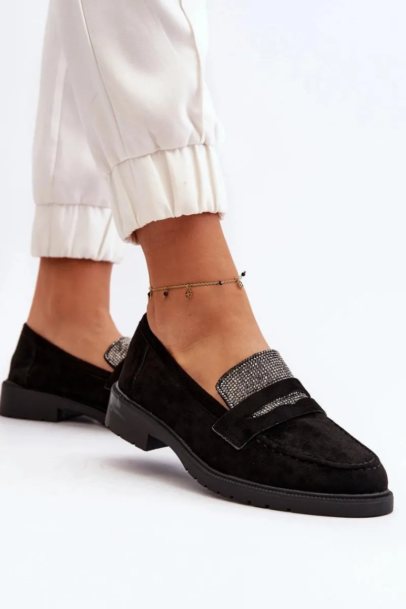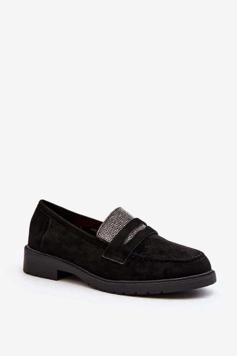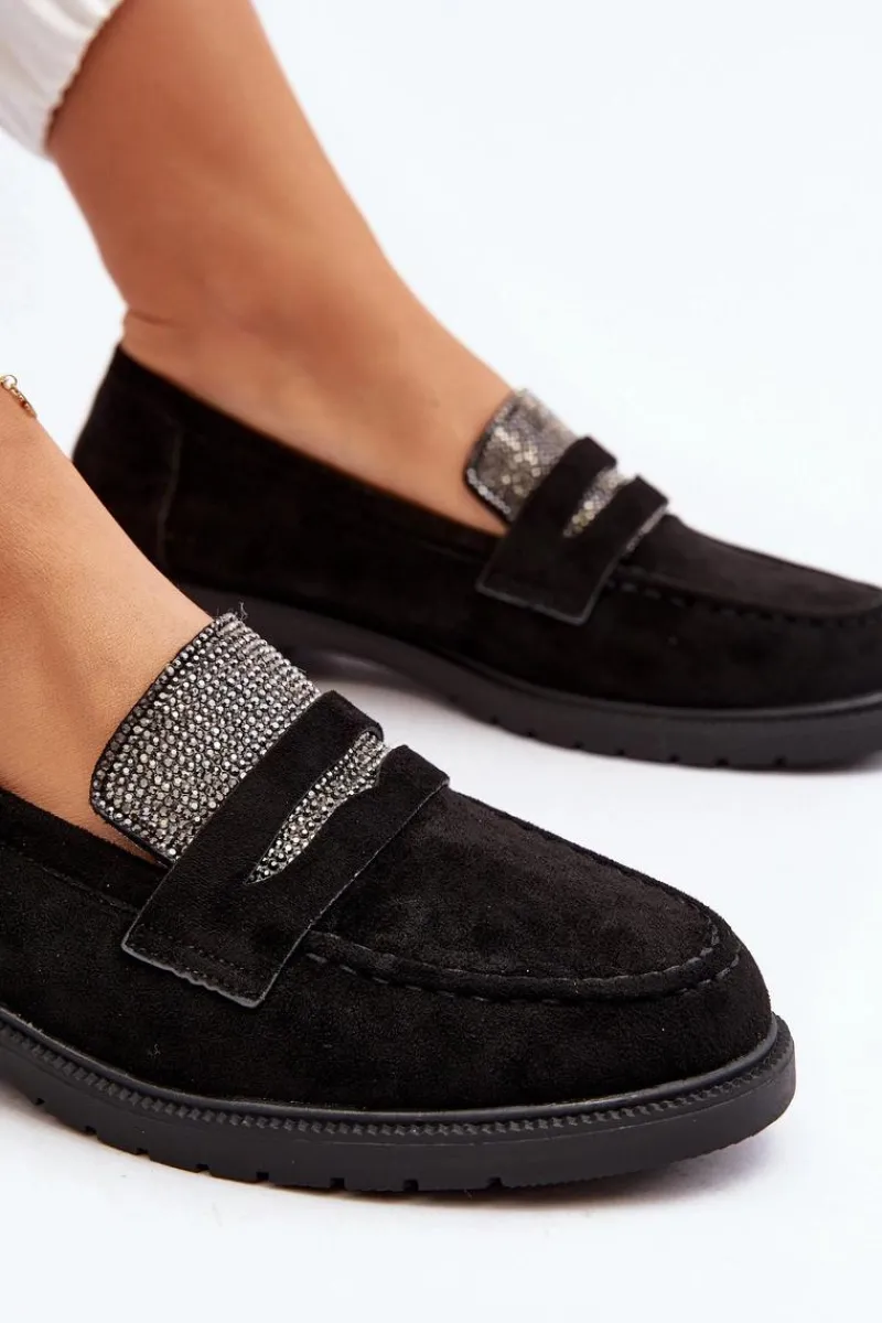 Damskie mokasyny zostały wykonane z miłego w dotyku eko zamszu. Osadzone na płaskim obcasie. Ozdobione małymi, błyszczącymi cyrkoniami. Miękka, eko skórzana wkładka zapewni wygodę użytkowania. Noski zaokrąglone. Ten stylowy fason dopasujesz do wielu stylizacji! Koniecznie powinnaś je mieć! Przy wyborze rozmiaru prosimy sugerować się tabelą rozmiarów.