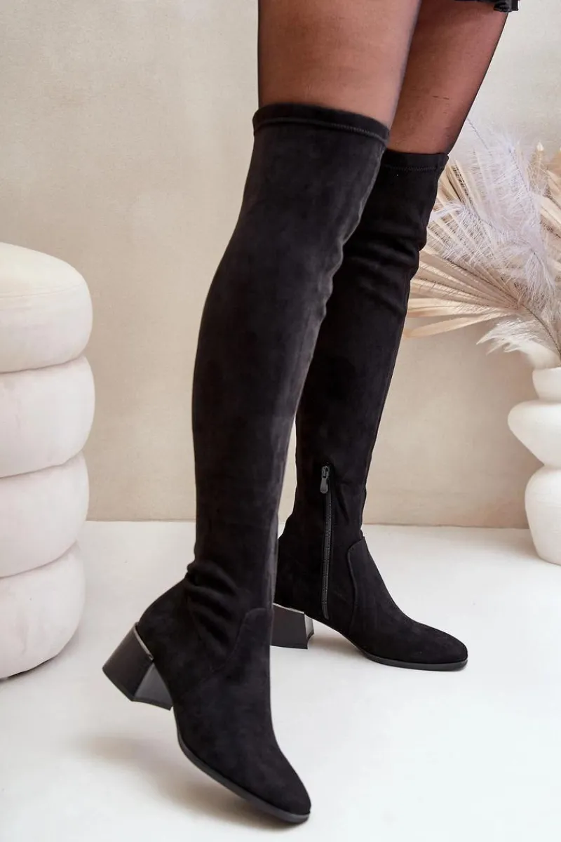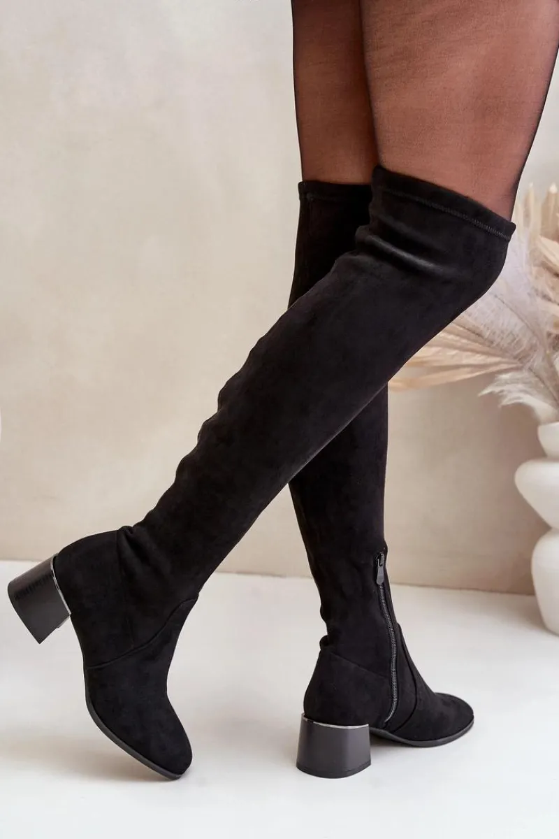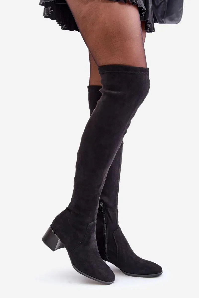 Stylowe damskie kozaki z cholewką sięgającą za kolano. Wykonane z ekologicznego zamszu. Osadzone na niskim, klockowym obcasie. Noski zaokrąglone. Model wsuwany z dodatkowym zamkiem błyskawicznym. Ocieplane kocem obuwniczym wyłącznie na wysokości stopy. Cholewka zdobiona przeszyciami. Doskonałe do mini sukienek lub spódniczek. To niezbędny element Twojej garderoby! Przy wyborze rozmiaru prosimy sugerować się tabelą rozmiarów.