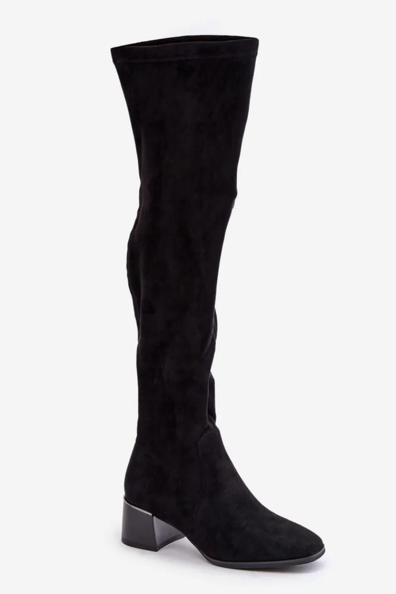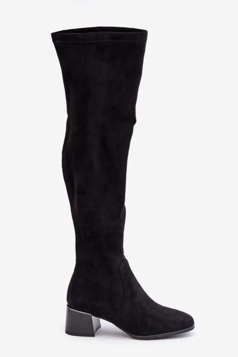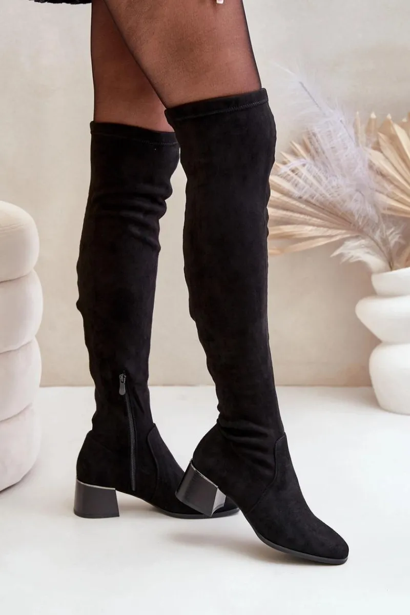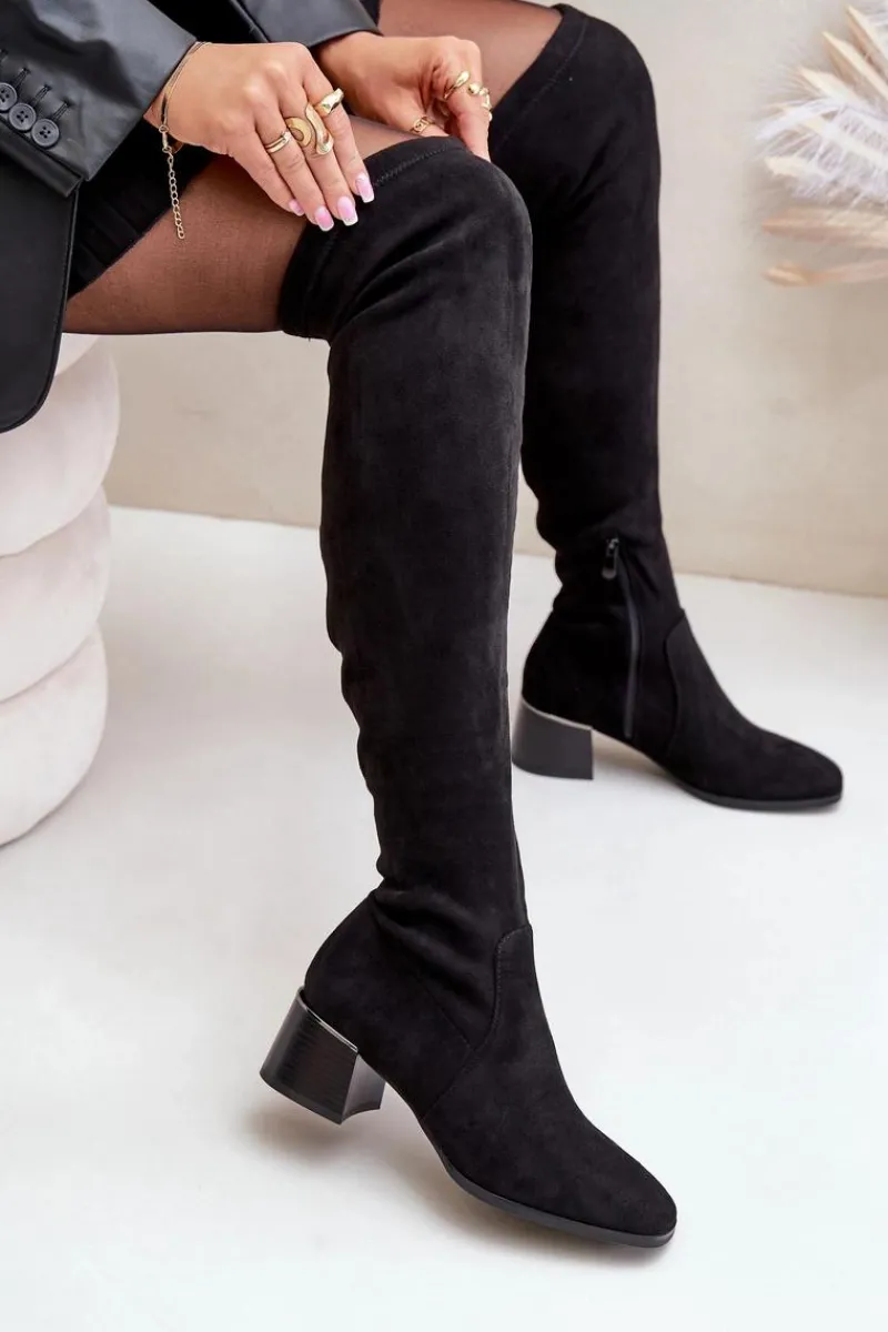 Stylowe damskie kozaki z cholewką sięgającą za kolano. Wykonane z ekologicznego zamszu. Osadzone na niskim, klockowym obcasie. Noski zaokrąglone. Model wsuwany z dodatkowym zamkiem błyskawicznym. Ocieplane kocem obuwniczym wyłącznie na wysokości stopy. Cholewka zdobiona przeszyciami. Doskonałe do mini sukienek lub spódniczek. To niezbędny element Twojej garderoby! Przy wyborze rozmiaru prosimy sugerować się tabelą rozmiarów.