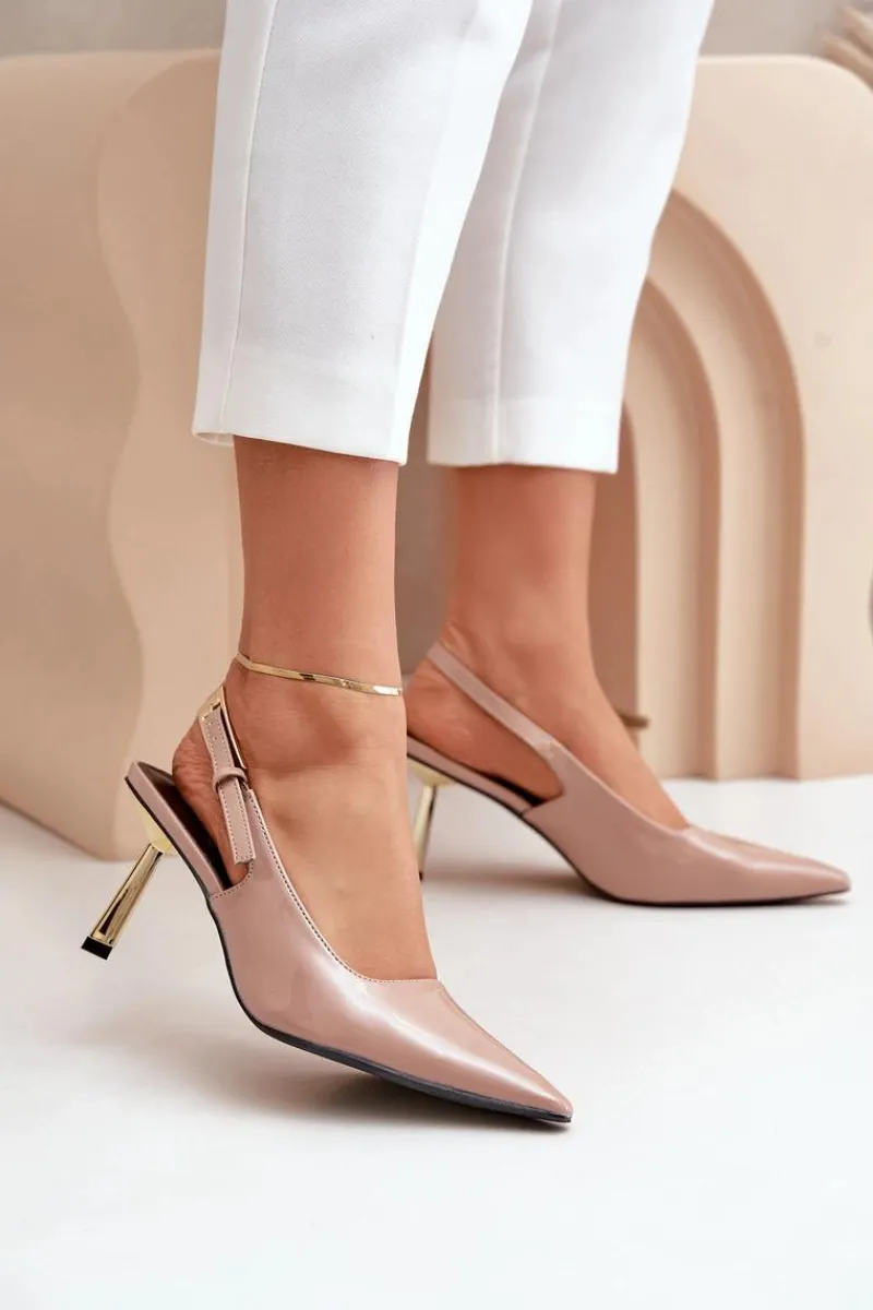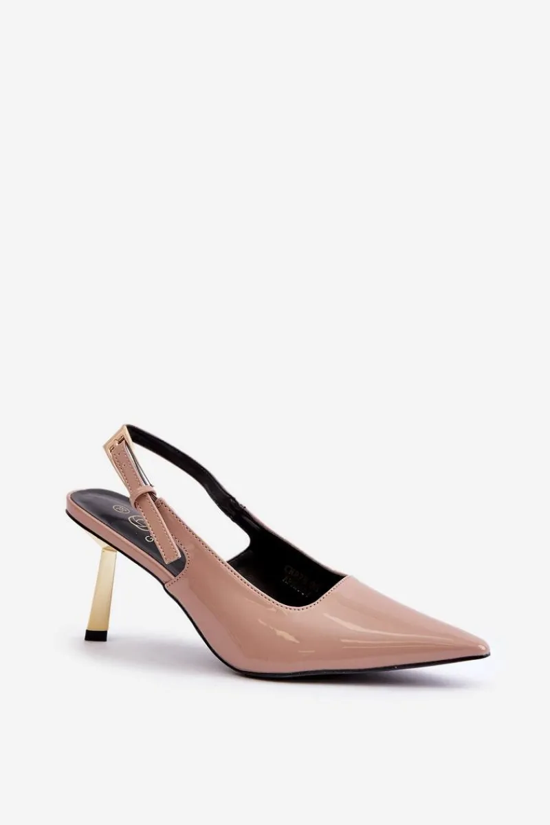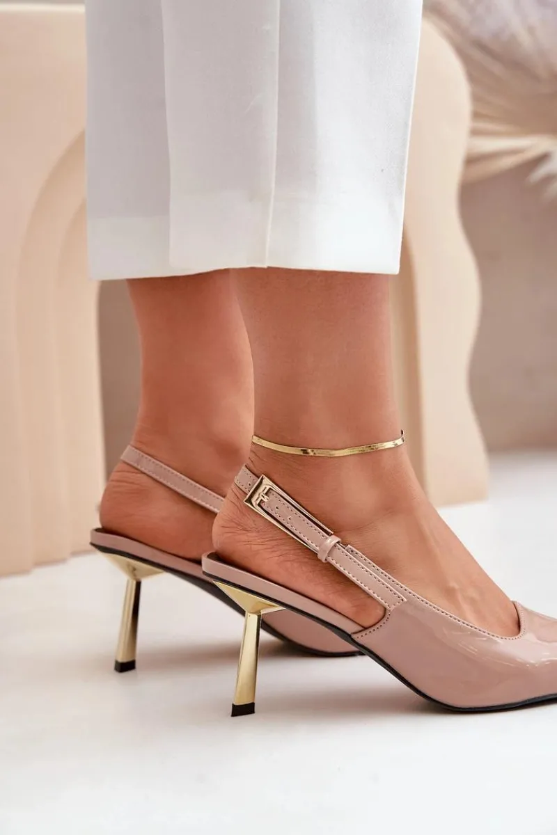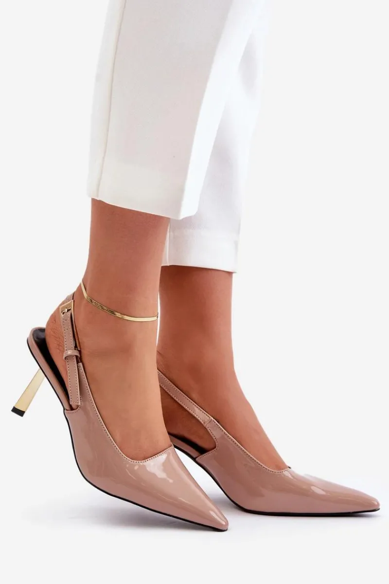Eleganckie szpilki z lakierowanej eko skóry to wyjątkowy wybór dla miłośniczek stylowych akcentów. Model osadzony na ozdobnej, złotej szpilce dodaje szyku każdej stylizacji. Szpiczaste noski podkreślają elegancję butów, a regulowany pasek ze sprzączką zapewnia wygodne i pewne dopasowanie. Idealne na wyjątkowe okazje, doskonale dopełnią wieczorowe i koktajlowe kreacje. Przy wyborze rozmiaru prosimy sugerować się tabelą rozmiarów.