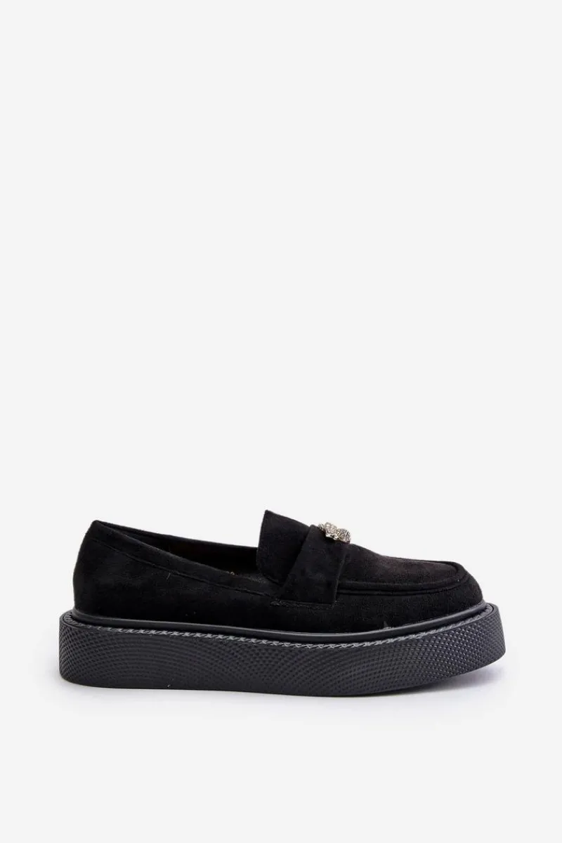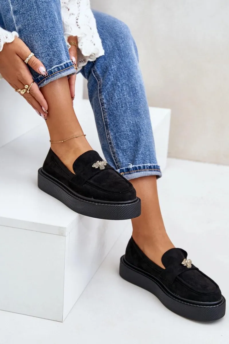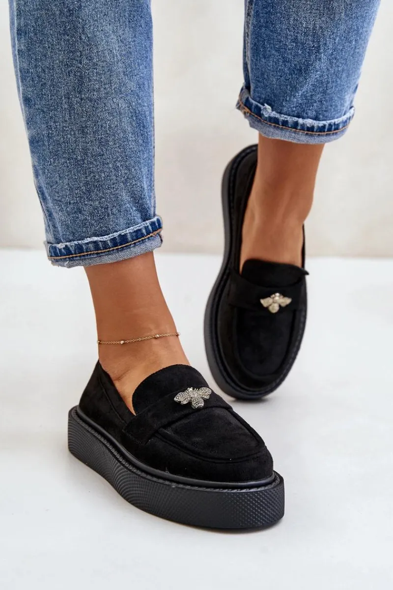 Stylowe mokasyny na platformie wykonane z eko zamszu. Z przodu ozdobione uroczą przypinką. Modne i wygodne, świetnie sprawdzą się w codziennych stylizacjach, zapewniając komfort noszenia przez cały dzień. Przy wyborze rozmiaru prosimy sugerować się tabelą rozmiarów.