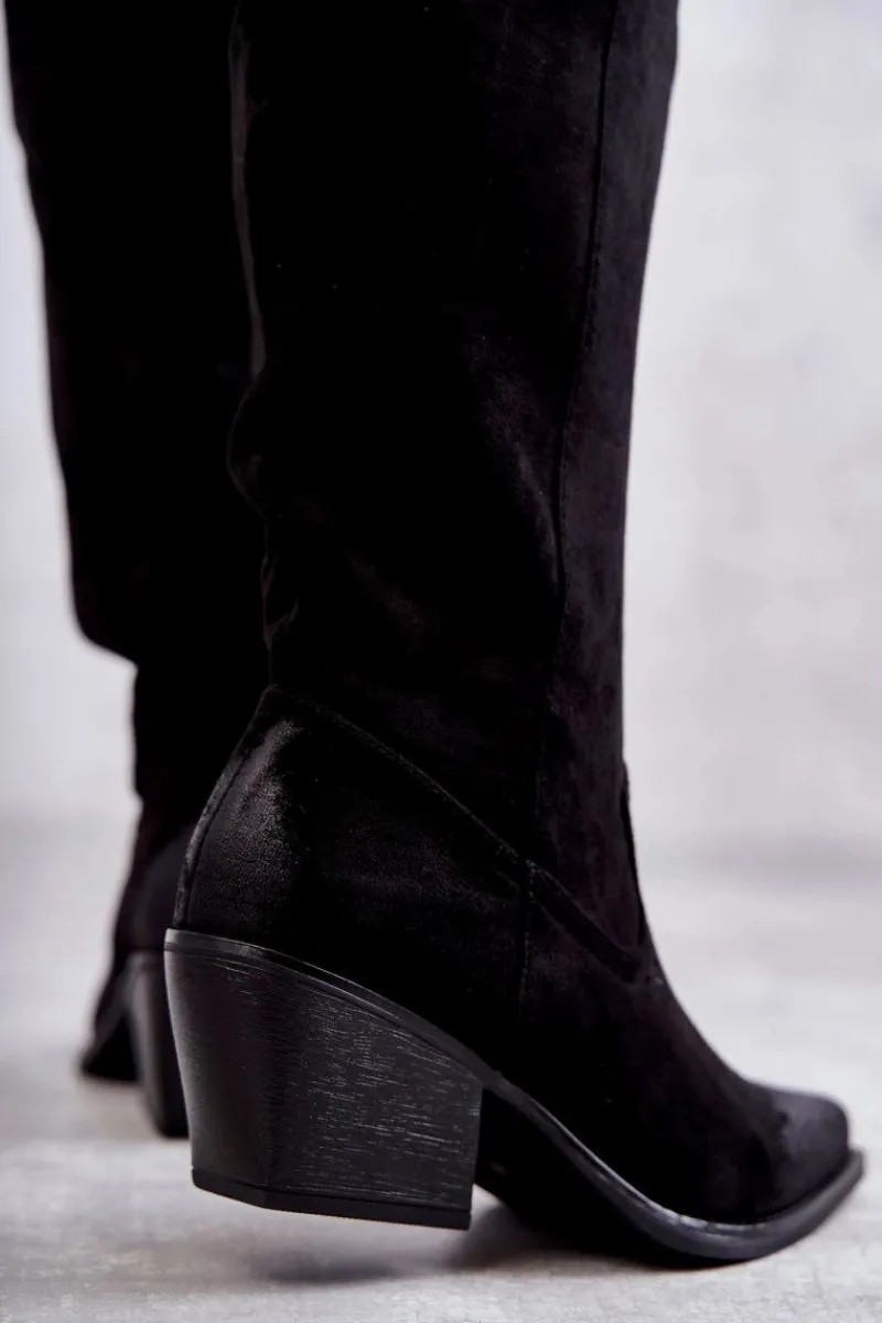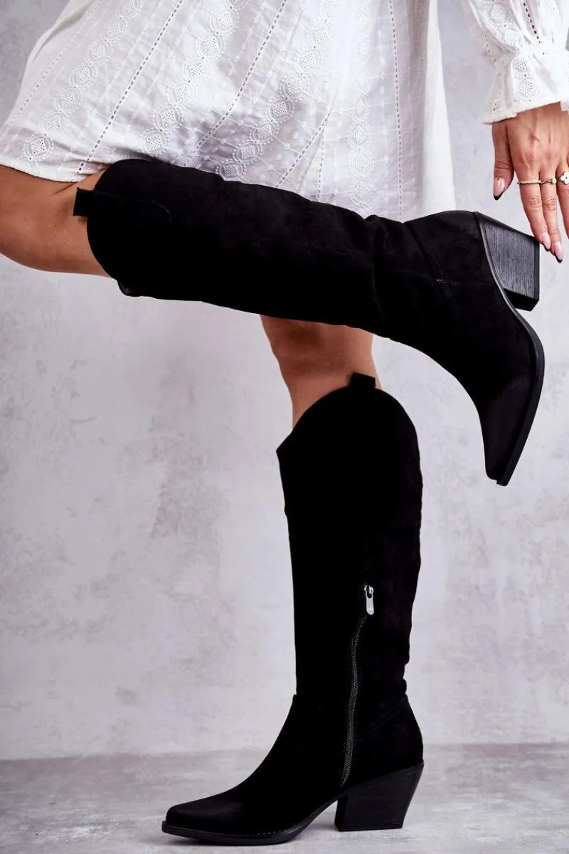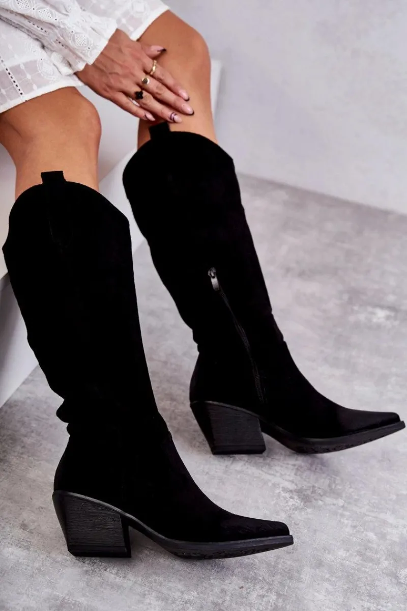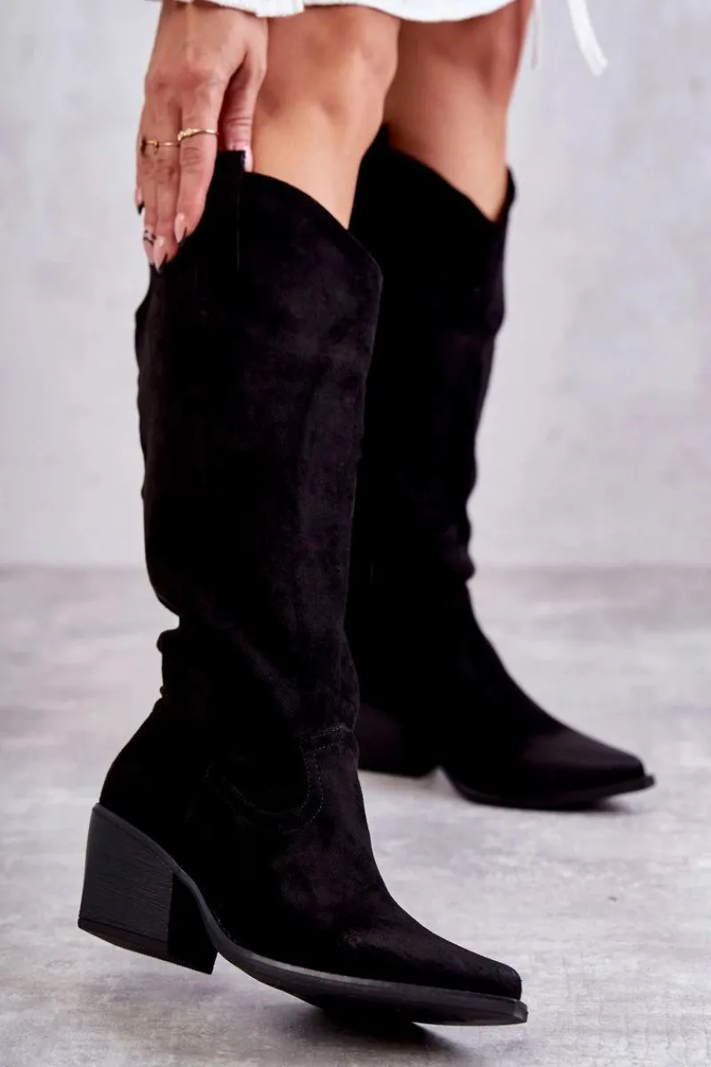 Kozaki – kowbojki zostały wykonane z przyjemnego w dotyku eko zamszu. Posiadają delikatne przeszycia na przodzie. Kozaki o fasonie kowbojek posiadają nosek w szpic oraz masywny obcas w postaci słupka. Model wsuwany z dodatkowym suwakiem z boku cholewki. Wkładka wykonana z eko skóry. Kozaki posiadają usztywniany zapiętek. Ten wyjątkowy model powinien być właśnie Twój! Przy wyborze rozmiaru prosimy sugerować się tabelą rozmiarów.
