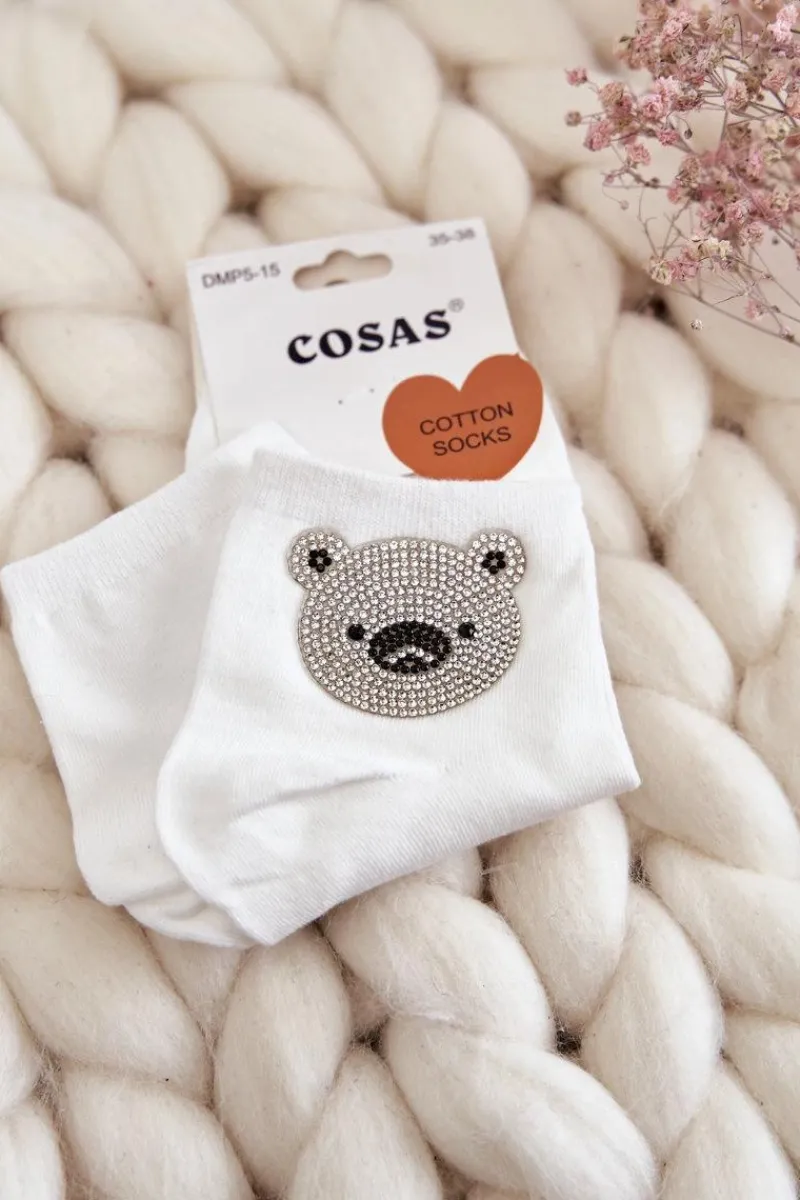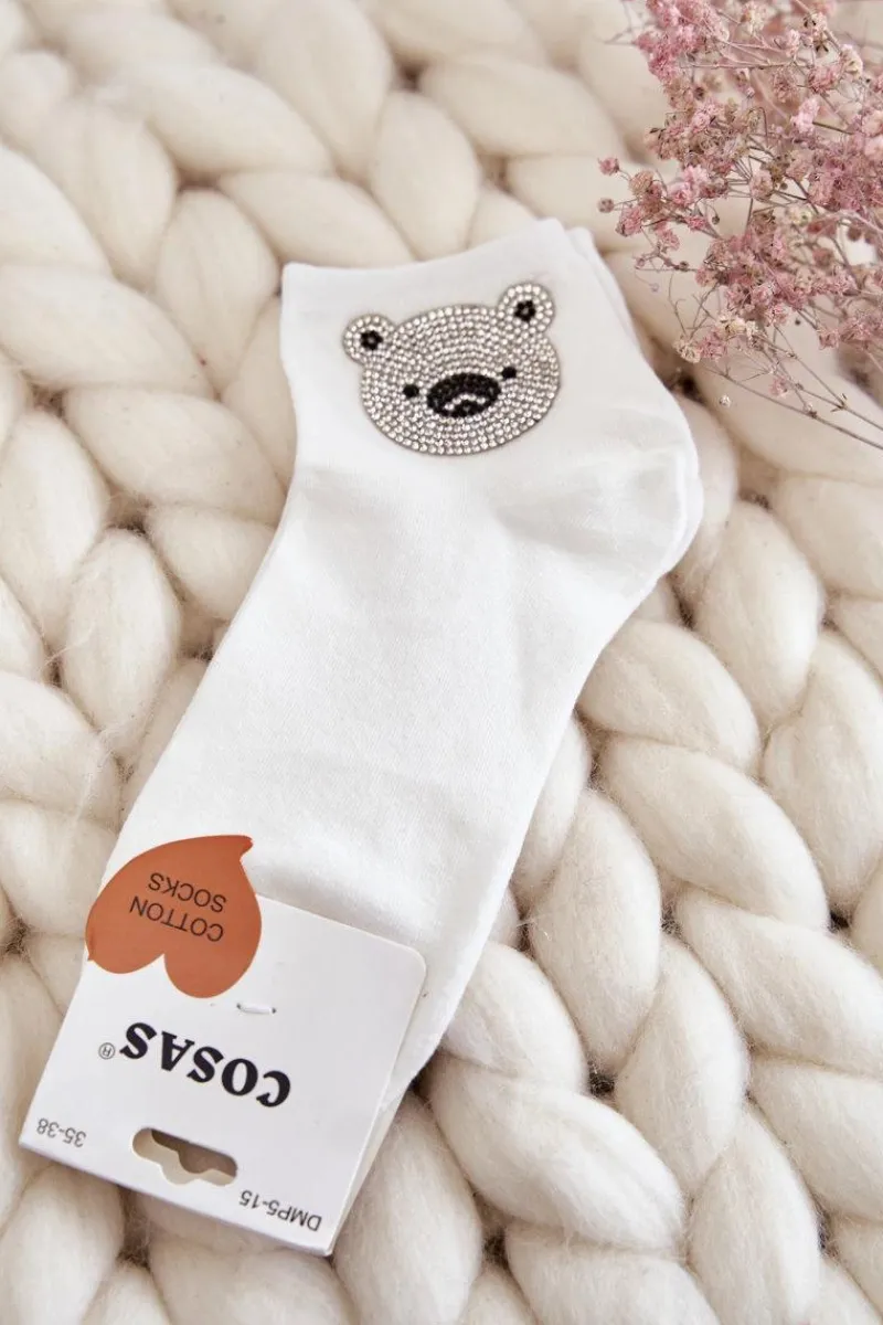 Damskie skarpetki zostały wykonane z wysokiej jakości bawełny z domieszką spandexu. Ozdobiono je mieniącymi się dżetami w postaci cyrkonii w kształcie misia. Delikatny ściągacz sprawi, że skarpetki będą idealnie dopasowane. Model za kostkę. Świetnie będą prezentować się do sportowego obuwia.