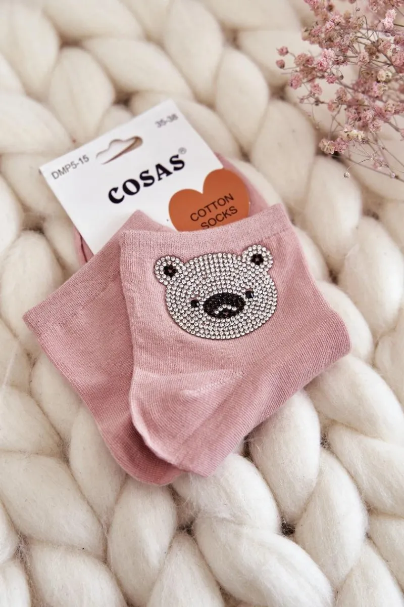 Damskie skarpetki zostały wykonane z wysokiej jakości bawełny z domieszką spandexu. Ozdobiono je mieniącymi się dżetami w postaci cyrkonii w kształcie misia. Delikatny ściągacz sprawi, że skarpetki będą idealnie dopasowane. Model za kostkę. Świetnie będą prezentować się do sportowego obuwia.