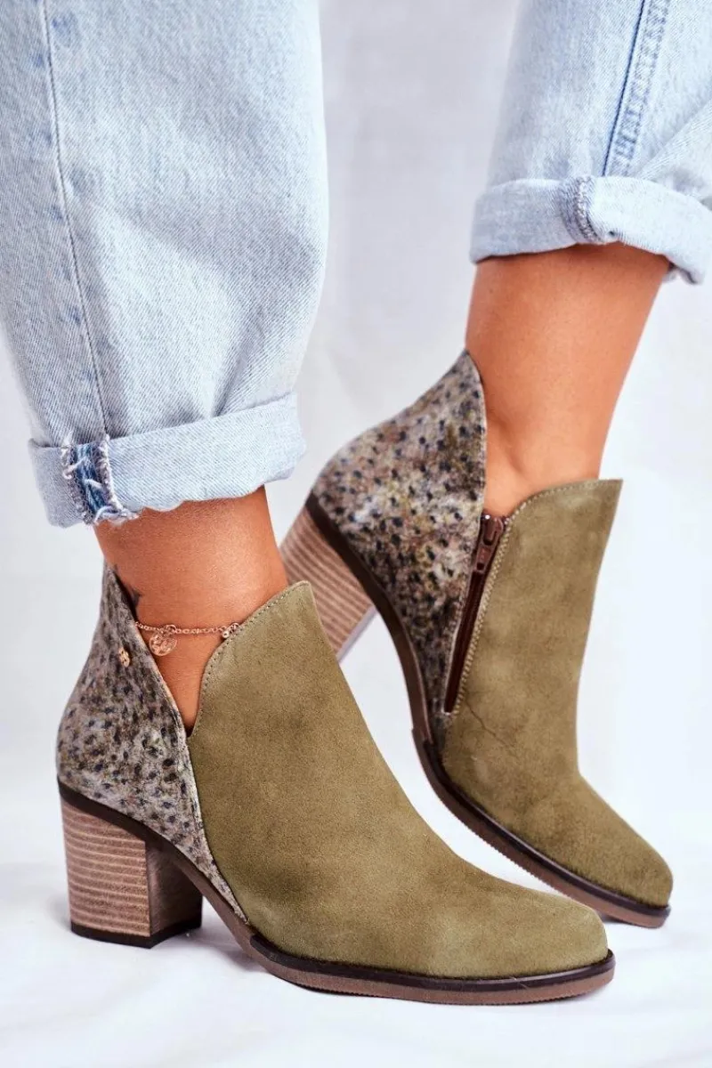 Discount Damskie Skórzane Botki Na Słupku Oliwkowe 04492-24 Damskie Botki Wiosenne|Botki Maciejka