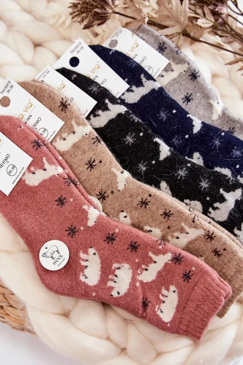 Ciepłe skarpetki damskie zostały wykonane głównie z wełny. Idealnie sprawdzą się podczas chłodnych dni. Posiadają zimowe wzory w niedźwiedzie polarne. Delikatny ściągacz sprawi, że będą idealnie dopasowane. Te termoaktywne skarpety idealnie sprawdzą się dla każdego zmarzlucha!