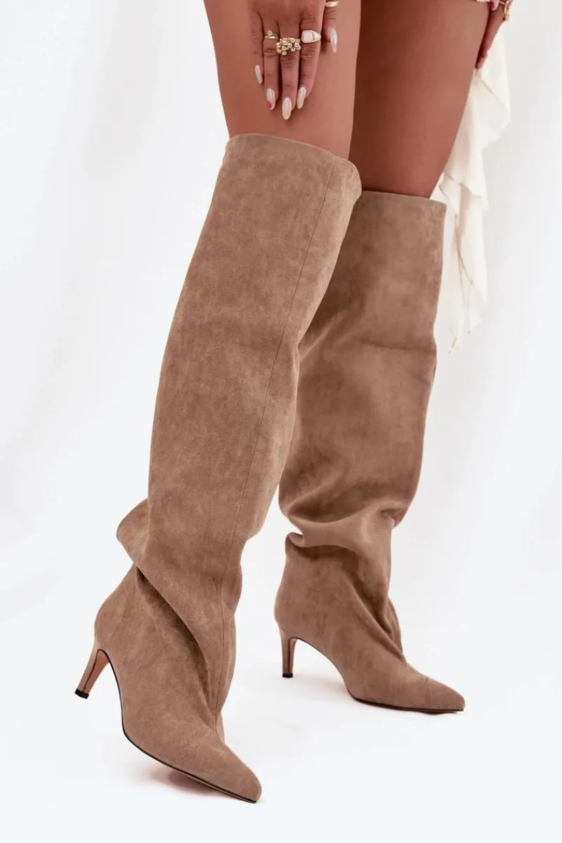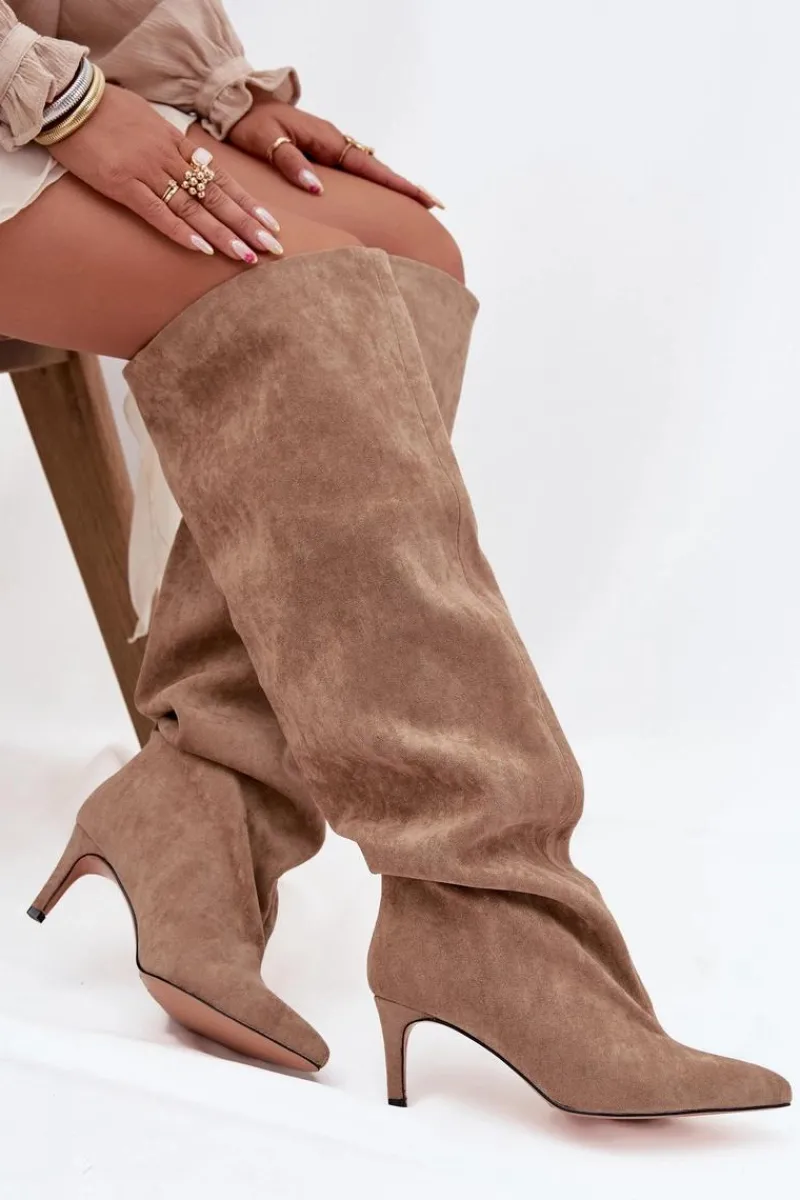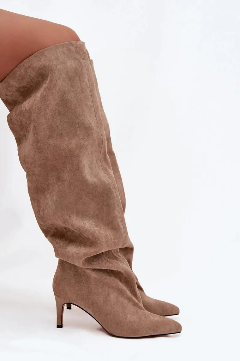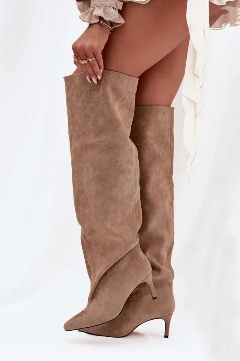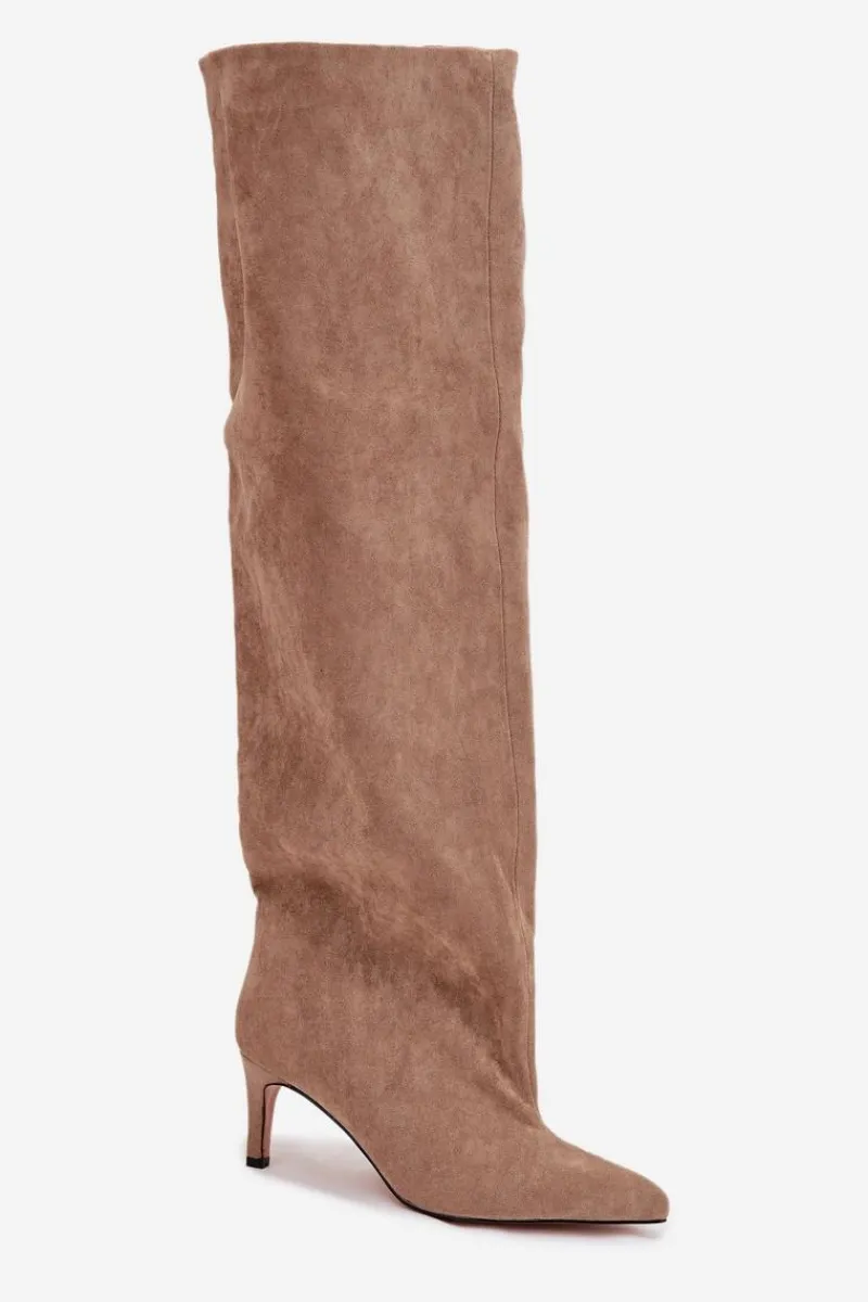 Kozaki Mavilla to propozycja dla kobiet, które cenią sobie elegancję i klasykę w nowoczesnym wydaniu. Wykonane z miękkiego eko zamszu w ciepłym beżowym odcieniu, prezentują się niezwykle stylowo i kobieco. Wysoka cholewka sięgająca za kolano pięknie wydłuża nogi, a smukła linia buta subtelnie podkreśla sylwetkę. To model, który doskonale łączy modny wygląd z wygodą użytkowania.