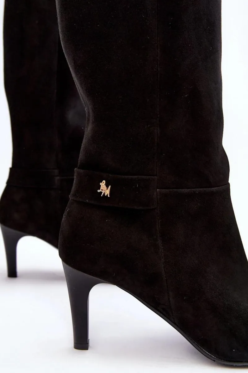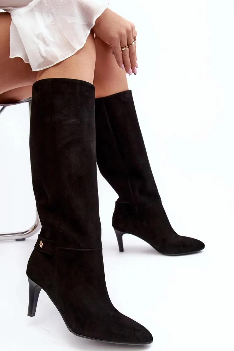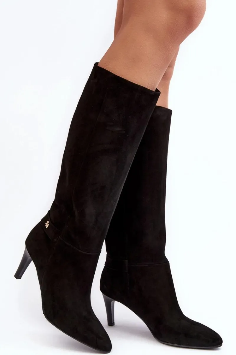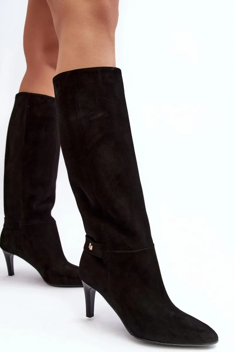 Eleganckie kozaki marki Laura Messi! Idealna propozycja dla osób ceniących sobie najwyższą jakość. Wykonane z naturalnego zamszu. Osadzone na niskim obcasie w postaci szpilki. Model wsuwany z cholewką przed kolano. Noski w migdał. Miękka wkładka zagwarantuje komfort podczas użytkowania. Dodatkowo zapiętek jest usztywniony. Przy wyborze rozmiaru prosimy kierować tabelą rozmiarów.