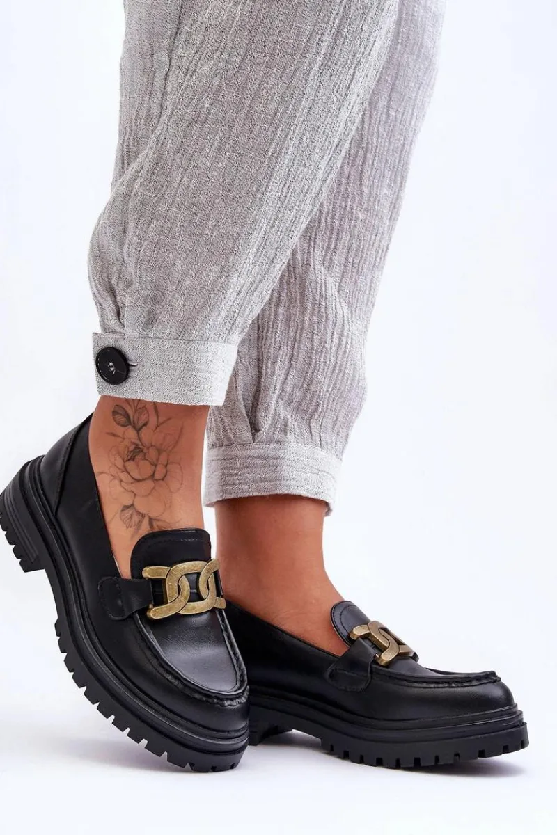 Stylowe, damskie mokasyny świetnie sprawdzą się do wielu stylizacji! Wykonane zostały z eko skóry. Model ten osadzony jest na masywnej platformie i płaskim obcasie. Z przodu znajduje się ozdoba. Koniecznie powinnaś je mieć! Przy wyborze rozmiaru prosimy sugerować się tabelą rozmiarów.
