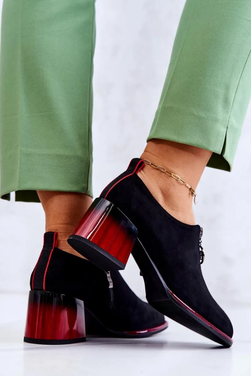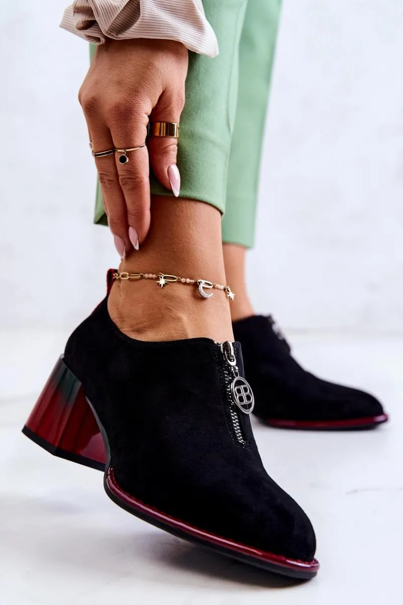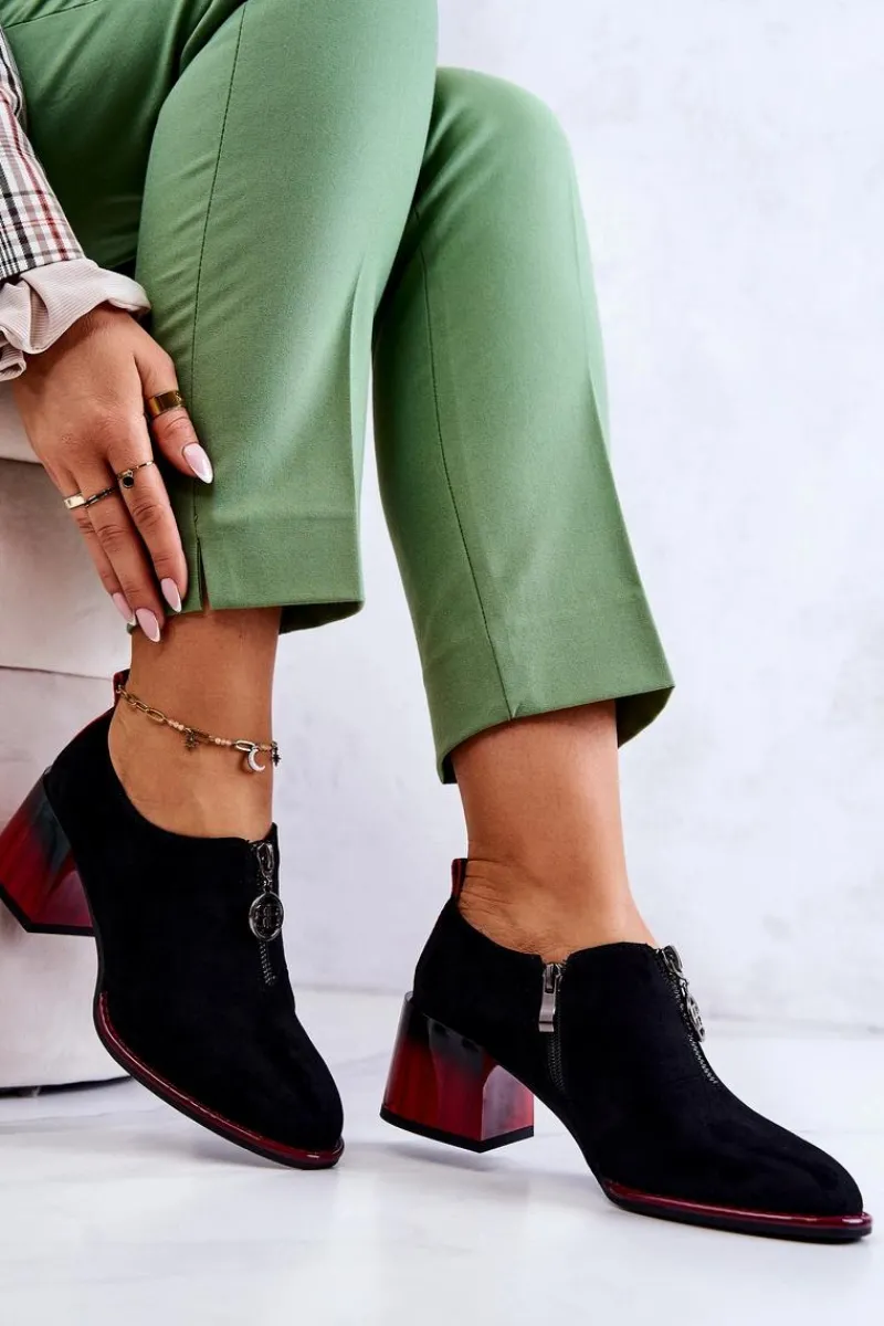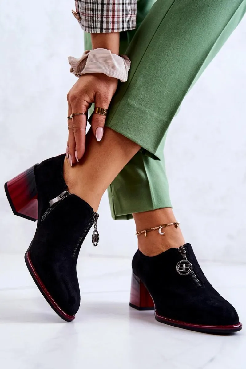 Półbuty z cholewką przed kostkę oraz suwakiem ułatwiającym zakładanie obuwia. Osadzone na obcasie w postaci masywnego słupka. Wykonane z wierzchu z zamszowej eko skóry z usztywnianym zapiętkiem. Z tyłu posiadają pętelkę ułatwiającą zakładanie i ściąganie obuwia. Nosek w kształcie migdała. Dodatkowo posiadają z przodu ozdobny suwak. Miękka wkładka została wykonana z naturalnej skóry. Ten model świetnie podkreśli Twoje stylizacje! Przy wyborze rozmiaru prosimy sugerować się tabelą rozmiarów.