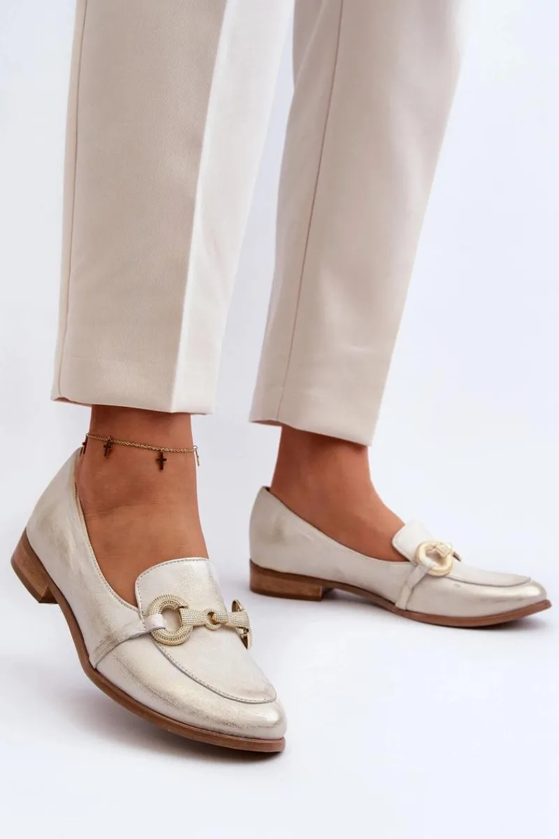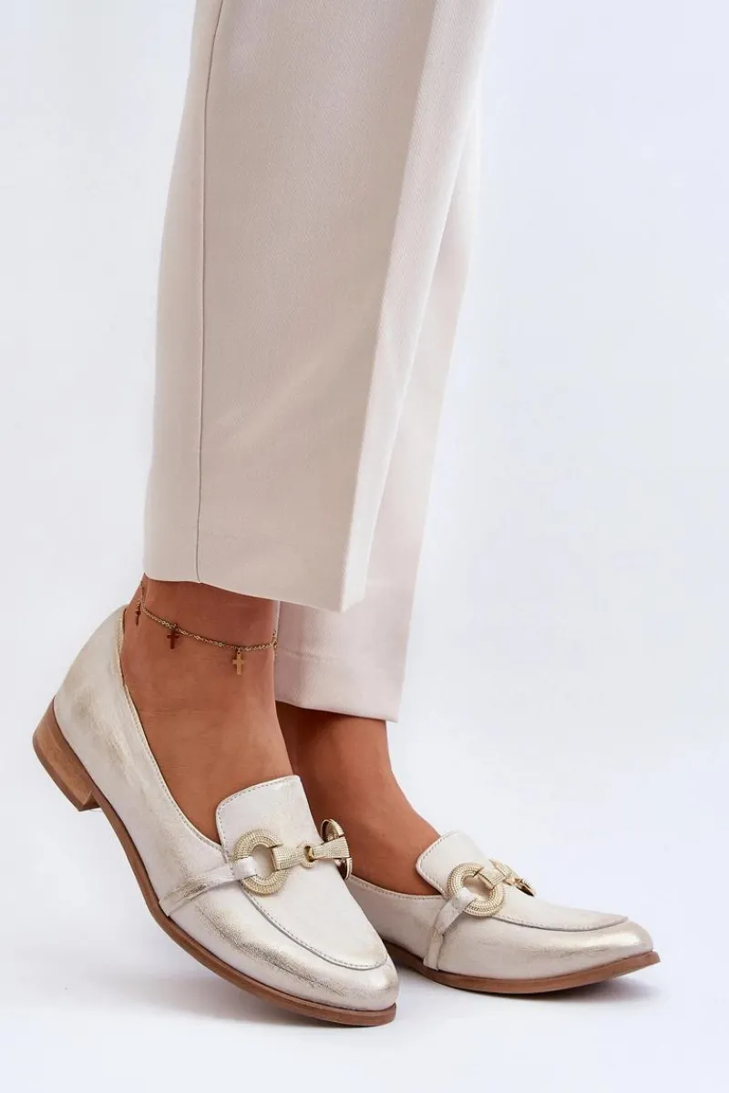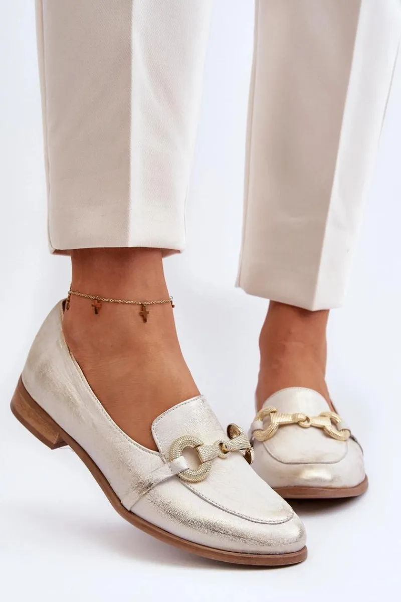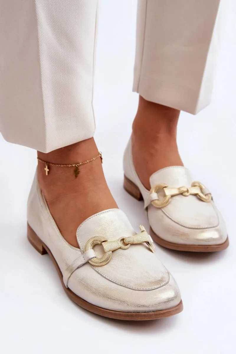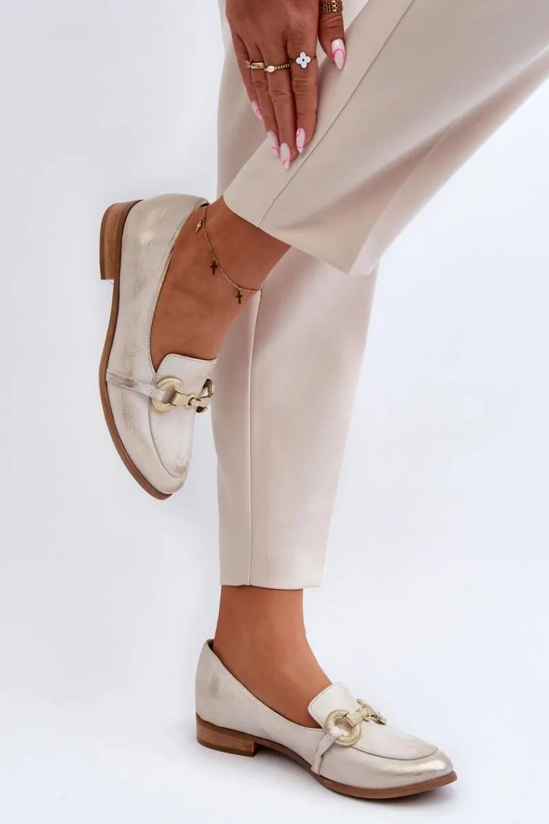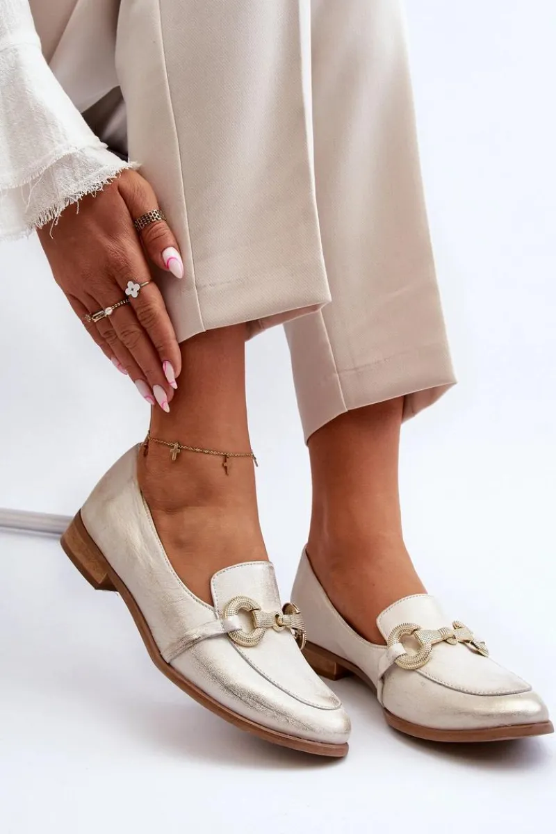 Eleganckie mokasyny damskie wykonane ze skóry naturalnej. Ten fason idealnie sprawdzi się w sezonie wiosenno-jesiennym. Noski zaokrąglone. Z przodu złota ozdoba. Usztywniony zapiętek. Wkładka ze skóry naturalnej zapewni komfort podczas noszenia. Ten model idealnie sprawdzi się zarówno w casualowych, jak i bardziej eleganckich outfitach! Przy wyborze rozmiaru prosimy sugerować się tabelą rozmiarów.