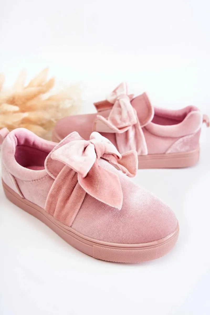 Modne trampki dziecięce typu slip-on. Wykonane z przyjemnego w dotyku materiału tekstylnego. Posiadają uroczą kokardę na środku. Dodatkowo buty posiadają gumkę, która pozwoli na odpowiednie dopasowanie obuwia do tęgości nogi. Wkładka wykonana z tkaniny jest miękka i komfortowa w użytkowaniu. Podeszwa została wykonana z gumowego tworzywa i jest dodatkowo antypoślizgowa. Z tyłu obuwia znajduje się pętelka ułatwiająca zakładanie i ściąganie obuwia. Przy wyborze rozmiaru prosimy sugerować się tabelą rozmiarów.