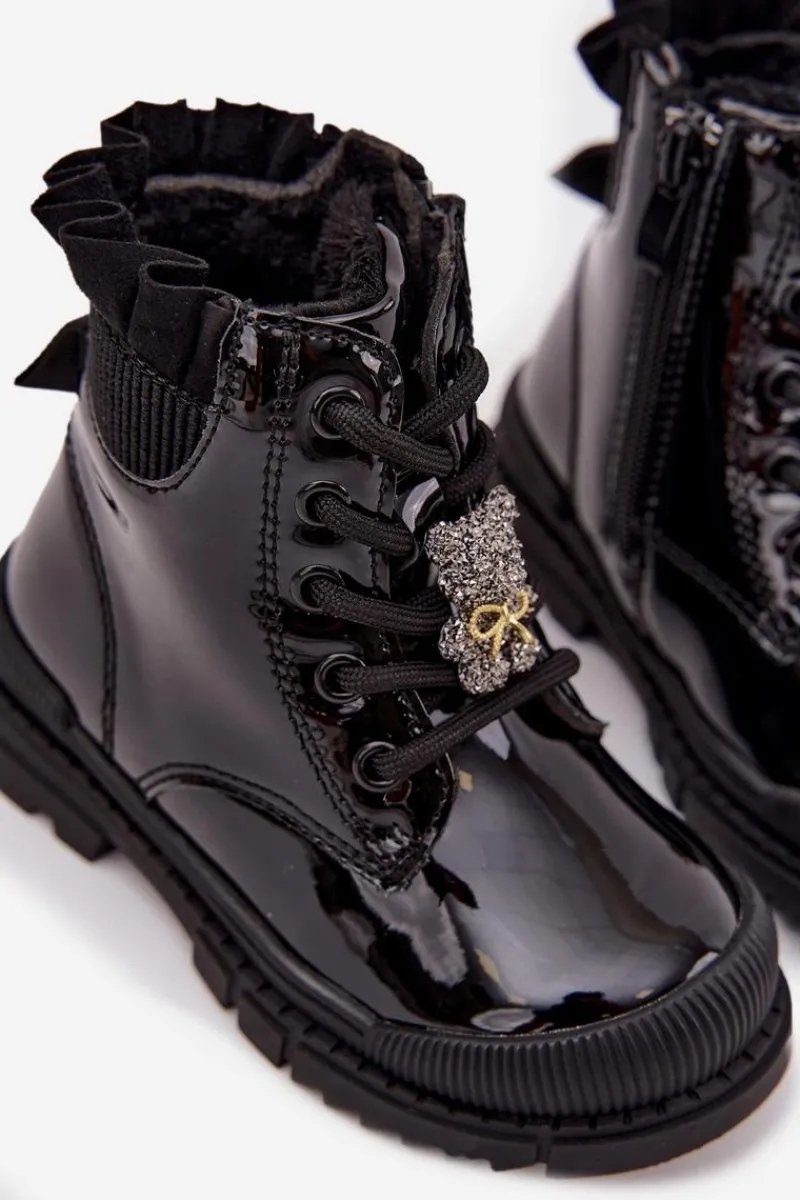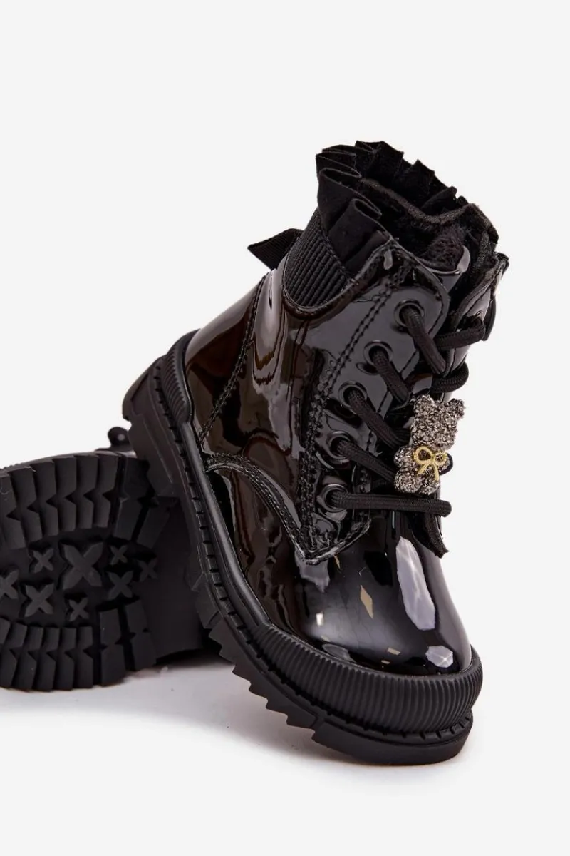 Botki dziecięce z lakierowanej eko skóry to stylowa i praktyczna propozycja na chłodniejsze dni. Wnętrze ocieplone miękkim futerkiem zapewnia ciepło i wygodę, a zamek z boku ułatwia zakładanie. Urocza przypinka w kształcie misia umieszczona na sznurowaniu dodaje wyjątkowego, dziecięcego uroku. Doskonałe na jesienno-zimowe dni.