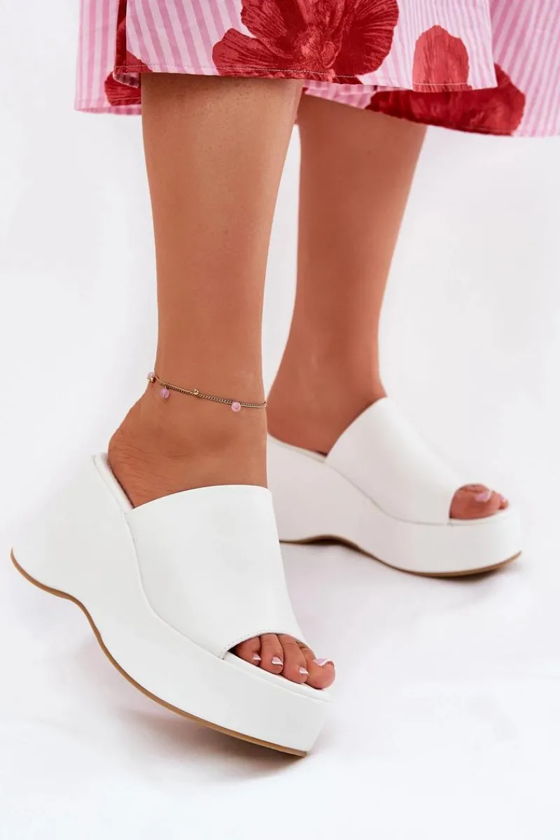 Stylowe klapki wykonane z eko skóry. Osadzone na platformie i koturnie, zapewniają stabilność i komfort przez cały dzień, jednocześnie optycznie wydłużając nogi i podkreślając sylwetkę. Miękka wkładka gwarantuje przyjemność noszenia, zapewniając odpowiednią amortyzację i wygodę podczas chodzenia. Te klapki doskonale sprawdzą się w codziennych stylizacjach, idealne do letnich sukienek, spódnic czy spodni. Przy wyborze rozmiaru prosimy sugerować się tabelą rozmiarów.