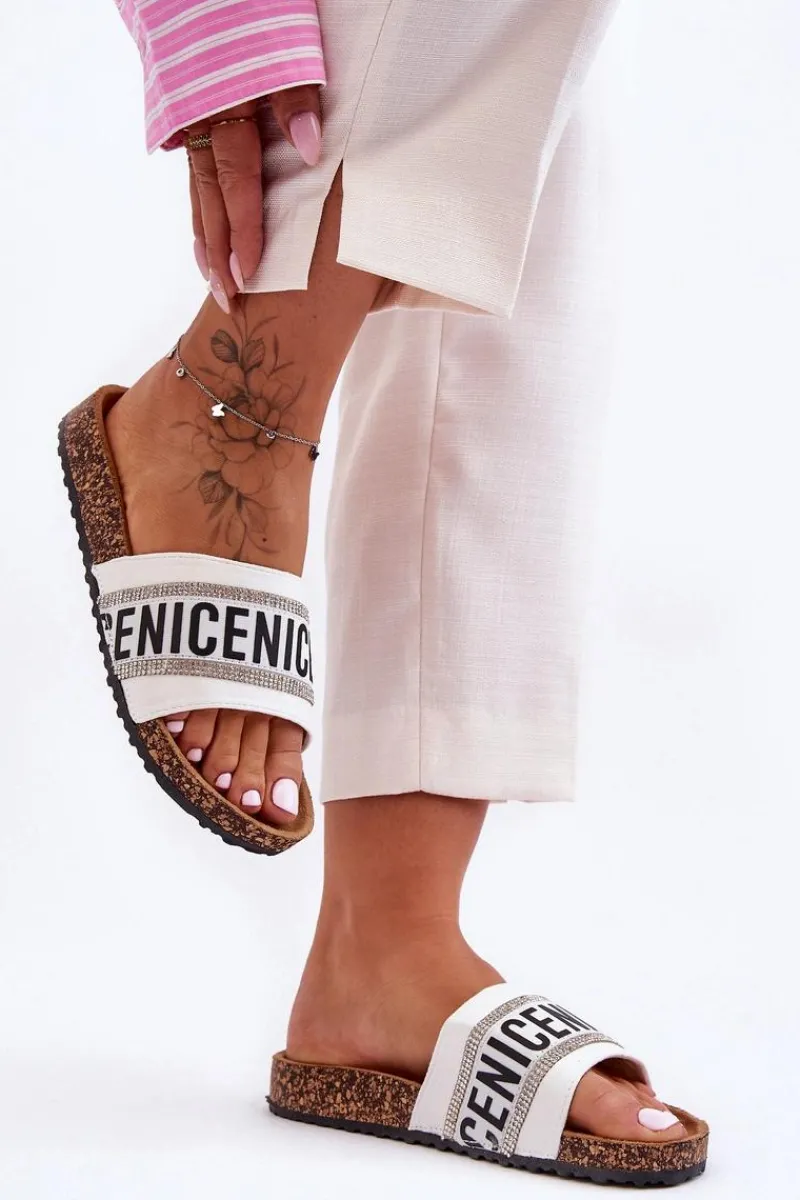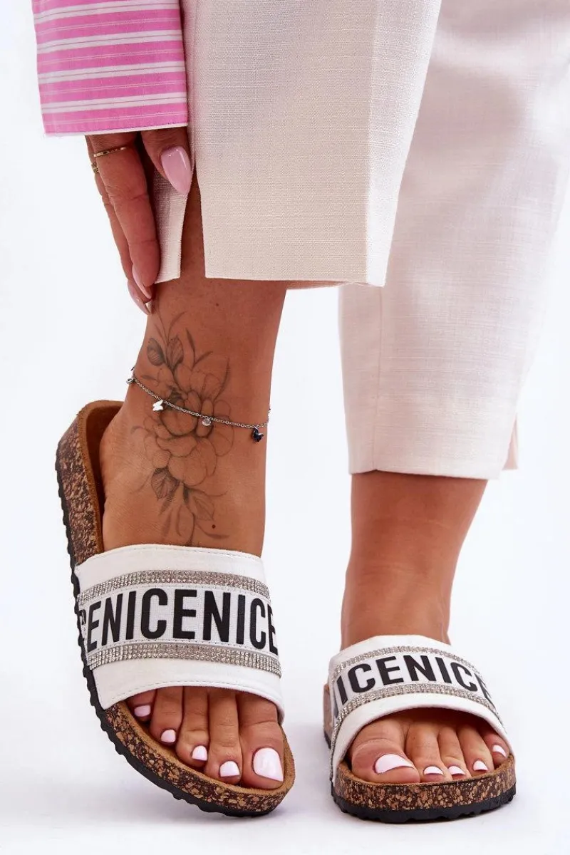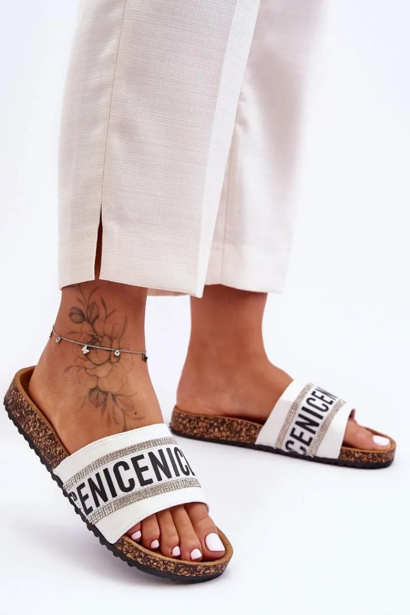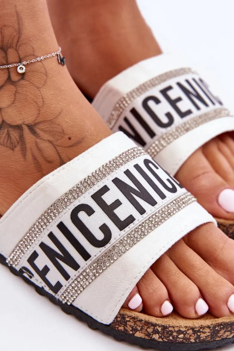 Komfortowe klapki damskie na korkowej podeszwie. Buty wykonane są z eko zamszu, posiadają delikatnie profilowaną wkładkę. Mody fason z cyrkoniami urozmaici Twoją garderobę!