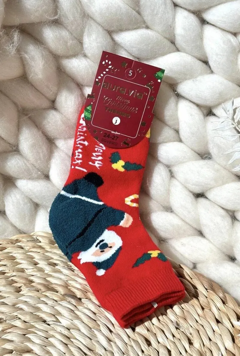 Dziecięce skarpety wykonane z bawełny, zapewniają komfort noszenia przez cały dzień. Skarpety ozdobione są uroczym motywem świątecznym z wizerunkiem Mikołaja, co nadaje im wesołego i świątecznego charakteru. Idealne na chłodniejsze dni. Skarpety są dostępne w różnych rozmiarach, dzięki czemu można je łatwo dopasować do dziecięcych stóp. Doskonały wybór na prezent świąteczny lub jako dodatek do zimowej garderoby dziecka.